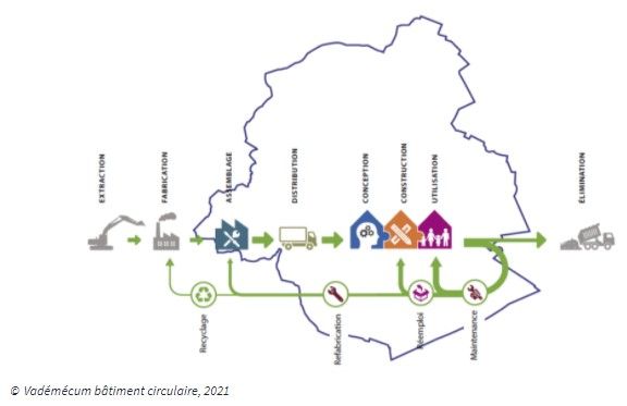 Plus tôt la démarche de circularité est implémentée dans le projet et dans les collaborations nécessaires, plus la conception et la réalisation circulaire auront la possibilité d’être ouvertes, créatives et efficaces. Cette démarche doit permettre la programmation et la mise en œuvre de principes favorisant entre autres « le maintien des ressources, les circuits courts, l’économie locale, l’allongement de la durée de vie des éléments et matériaux, la réduction de production de déchets… »