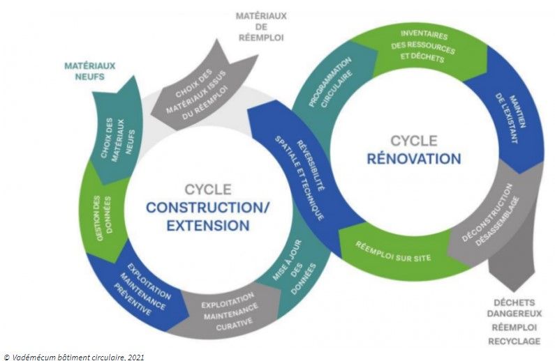 Dans ce cadre, le rôle du maître d’ouvrage est capital : « Il est en effet le premier maillon d’une chaîne de responsabilités pour mettre en œuvre cette ambition et une ou plusieurs stratégies d’économie circulaire dans son projet (construire pour la longévité, le démontage, le réemploi, etc.). Il peut concrétiser ces enjeux de différentes manières. D’une part, il est possible d’optimiser la capacité de chaque bâtiment (nouveau ou existant) à répondre efficacement à l’évolution des demandes et des besoins de ses utilisateurs. Il restera ainsi utilisable, ce qui prolongera sa durée de vie et maximisera sa valeur dans le temps. D’autre part, il est possible d’optimiser la gestion de tous les flux de matériaux liés au bâtiment, afin d’éviter l’épuisement des ressources naturelles et la production de déchets, minimisant ainsi l’impact environnemental des bâtiments. »