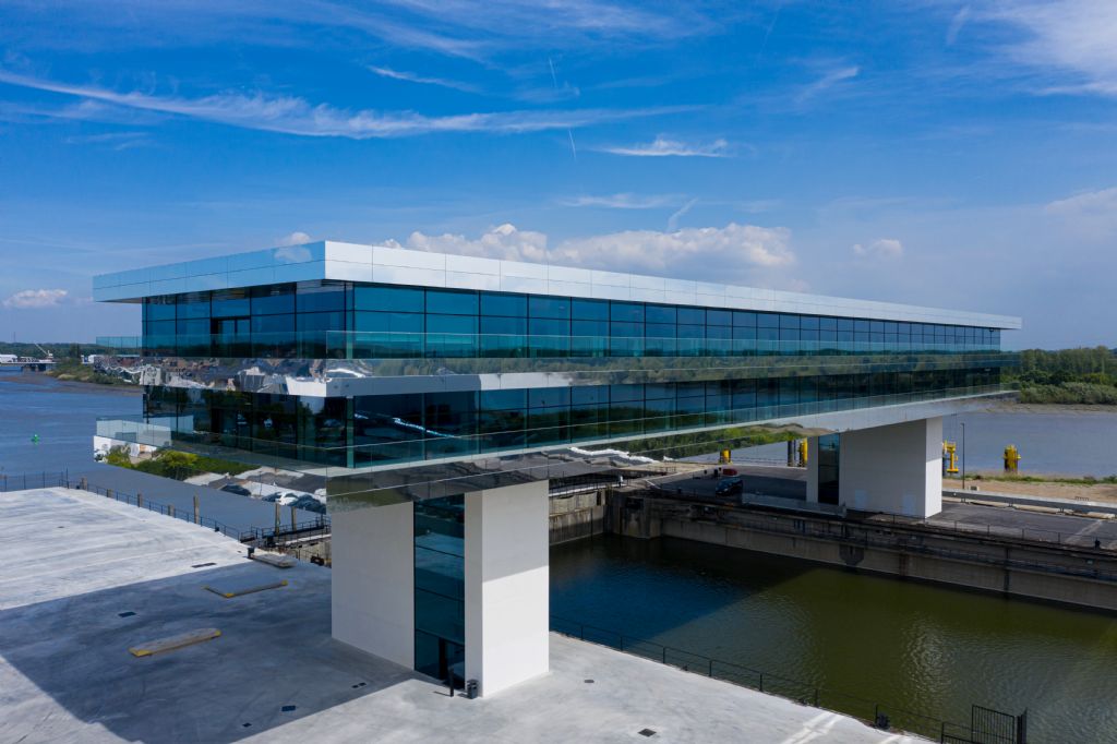 Une prouesse architecturale, un exploit technique, un accroche-regard unique : il existe de nombreuses façons de décrire le nouveau siège social de Cordeel à Tamise (Temse). Cette poutre, parallélépipède rectangle de 108 m de long, a été conçue par BINST ARCHITECTS et surplombe l'ancienne cale sèche du Boelwerf – un ancien chantier naval sur l’Escaut - stratégiquement situé sur un bras latéral du fleuve. L'acier, le verre, les panneaux de façade réfléchissants et une ambition sans bornes sont les ingrédients qui font de ce joyau de la construction un bâtiment unanimement apprécié.