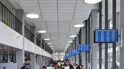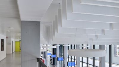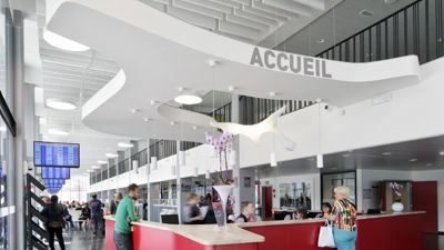L'intérieur est resté lumineux et transparent, tandis que les visiteurs repèrent facilement le guichet d'information en raison de ses formes ondulées marquantes. Patrick Vonck, architecte : "Le bâtiment est très 'carré', une particularité que nous avons compensée par d'autres formes irrégulières comme on peut le voir à l'accueil. L'endroit attire d'emblée le regard et oriente rapidement le visiteur. Les baffles Rockfon utilisés dans la salle des guichets créent eux aussi un mouvement de légère ondulation." Ils créent un excellent climat acoustique dans un environnement dominé par les matériaux durs comme le verre et le béton. "Dans cet espace public, il était vraiment nécessaire d'utiliser ce système pour amortir le bruit et renforcer ainsi le confort des personnes." Pour être précis, 782 panneaux ont été posés après les calculs du bureau d'études. Ceux-ci présentent une largeur de 1,20 m pour une hauteur de 60 cm et offrent une acoustique agréable. Outre cette qualité, ils se fondent harmonieusement dans le rythme de l'architecture. Des baffles ont également été posés dans les salles de réunion, mais ceux-ci sont de plus petites dimensions (1,20 m x30 cm), car il n'y a pas de bruit ambiant dans ces pièces.