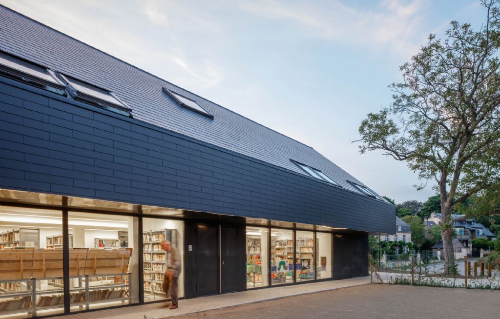 Dans ce projet, L’intégration au contexte historique, social et sociétal est primordiale. Les architectes ont cherché à intégrer la nouvelle construction pour qu’elle paraisse être une grange ou un ancien bâtiment rural habilement réaffecté. Pour cela, l’implantation, le gabarit, l’expression volumétrique et les matières cherchent à tisser lien avec l’existant dans un respect de celui-ci. Après avoir quelque peu « institutionnalisé » la façade avant, le travail architectural sur la façade arrière s’est voulu plus « privé ». Le traitement du pignon quant à lui, met en relation forte la zone de recul et la bibliothèque par le passage couvert qui s’exprime sur le pignon pour articuler le cheminement piéton, l’arbre remarquable et les relations souhaitées par la bibliothèque avec le cœur du village.