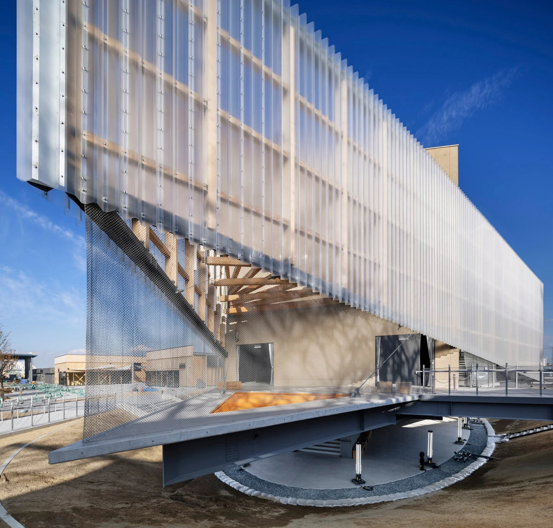 « Nous avons créé une « courte boucle circulaire » qui donne aux matériaux temporaires utilisés pendant la construction un nouveau rôle, qui les met en lumière », a déclaré l'architecte en chef Takushu Arai à Dezeen. « La sélection se concentre sur des matériaux familiers aux ouvriers du bâtiment. Les éléments en acier utilisés pour les colonnes et les poutres sont boulonnés ensemble avec un minimum de soudure, afin de faciliter le démontage après l'Expo », a-t-il poursuivi.