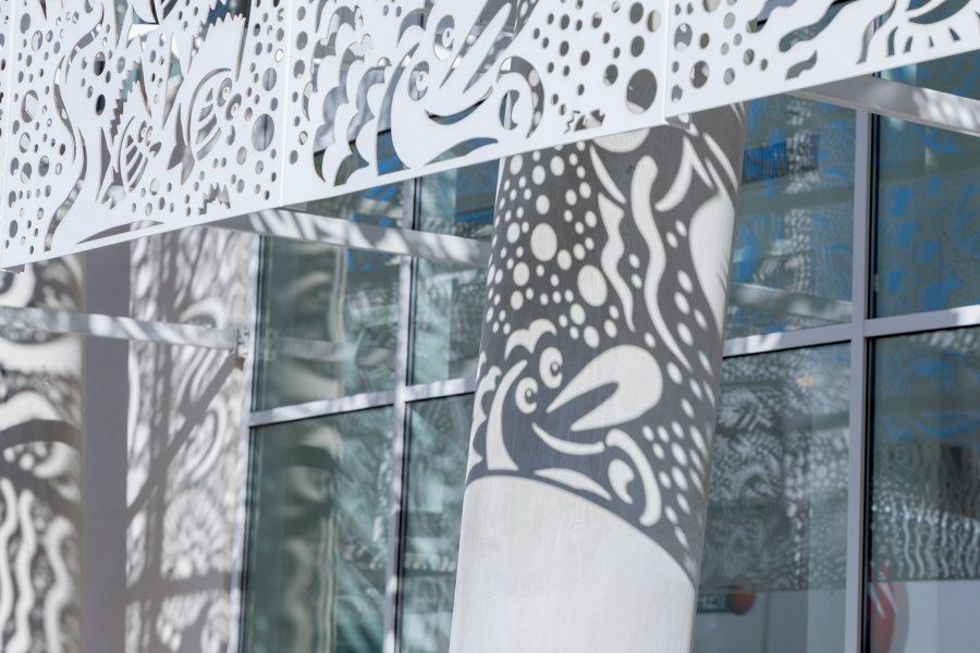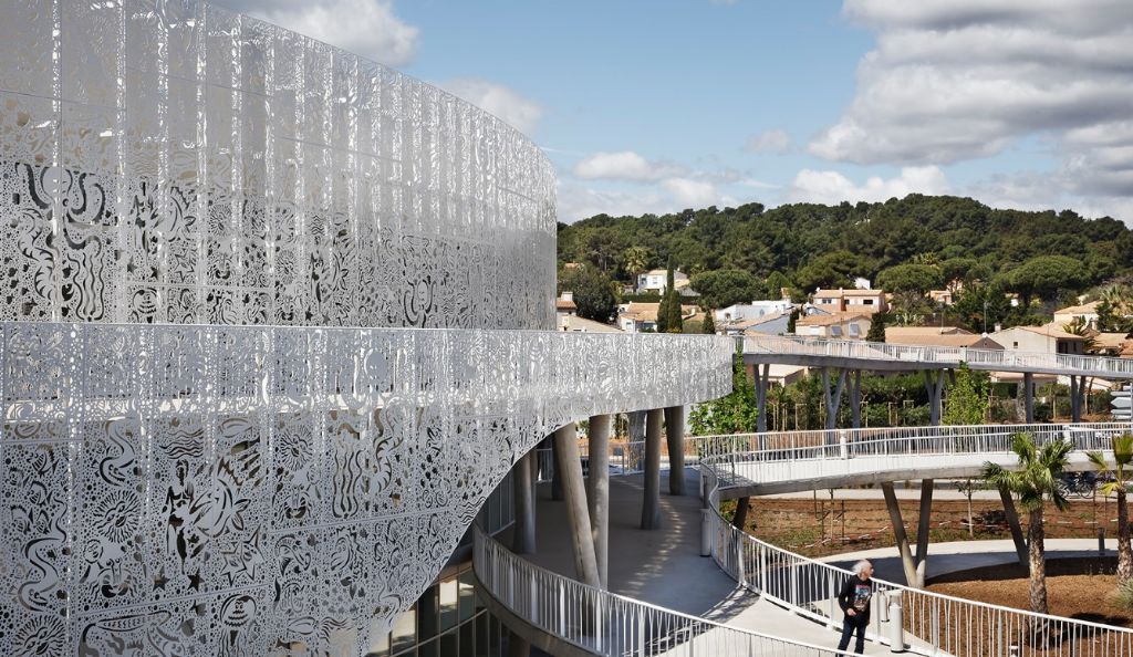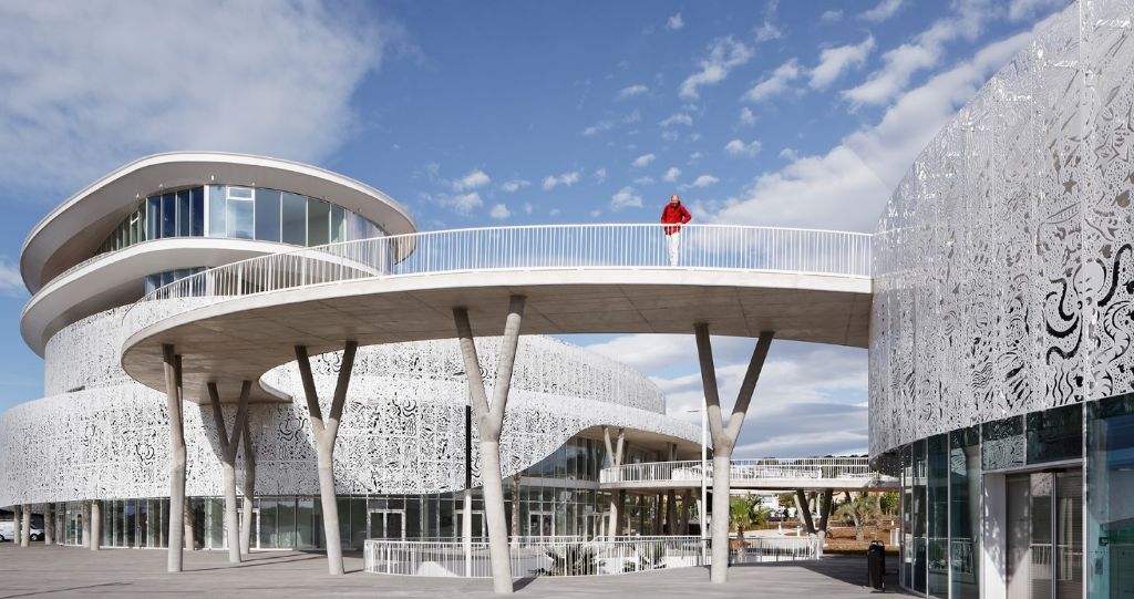 En étroite collaboration avec A+Architecture, Hervé di Rosa, artiste d’origine sétoise, a joué de manière malicieuse sur le thème des fonds marins pour concevoir la résille métallique blanche de 2900 m2 qui enveloppe les deux bâtiments de ce belvédère entre terre, mer et ciel.
