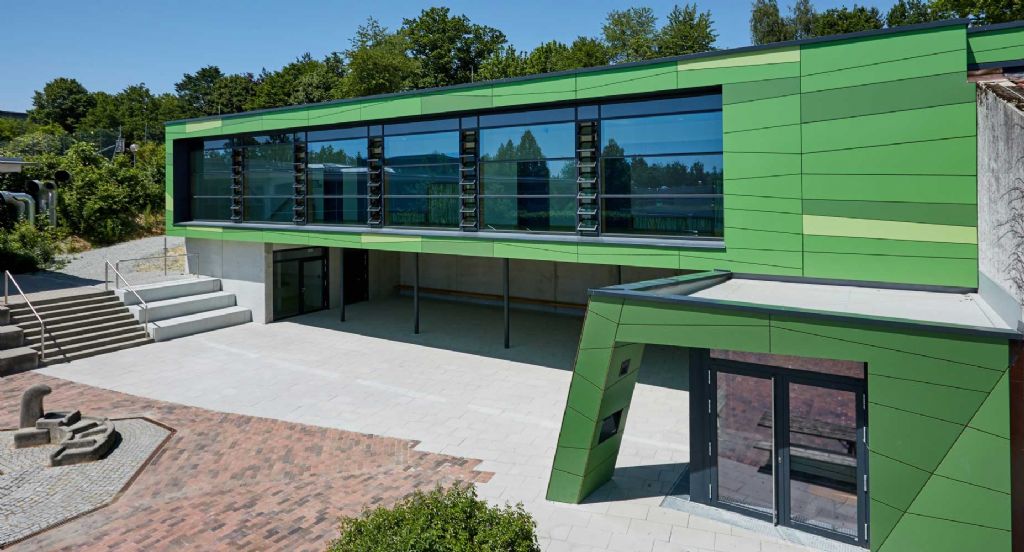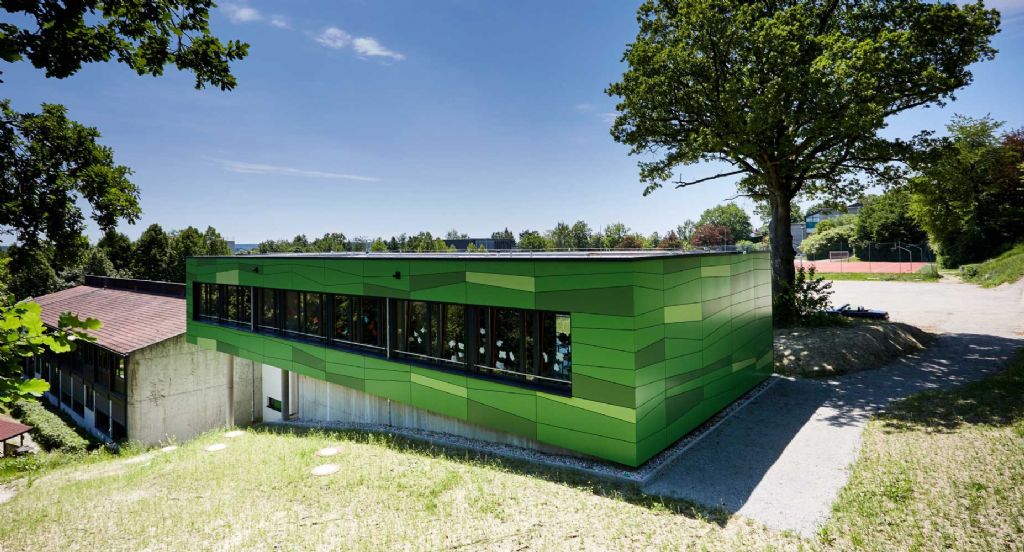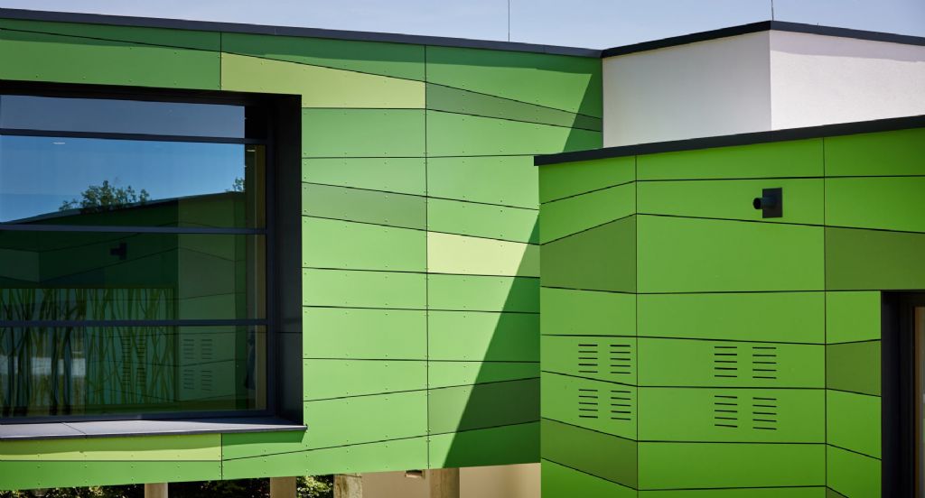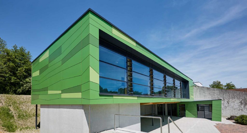 Simple, facile à entretenir et attrayante, voilà ce que précisait le cahier des charges pour la façade de l’extension de cette école de Pfarrkirchen en Bavière. Le résultat : une façade ventilée parée de panneaux Rockpanel Colours. Les trois nuances de vert, la disposition irrégulière des panneaux et les lignes brisées cassent la monotonie et donnent de la vie au bâtiment.