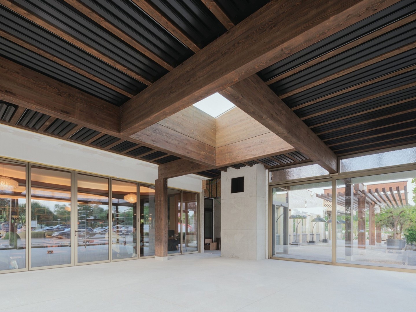 Les poutres convergent au centre autour de l'oculus, une ouverture dans la structure avec une grande lucarne pour laisser entrer beaucoup de lumière. Bollinger+Grohamm a fourni l'étude de stabilité.