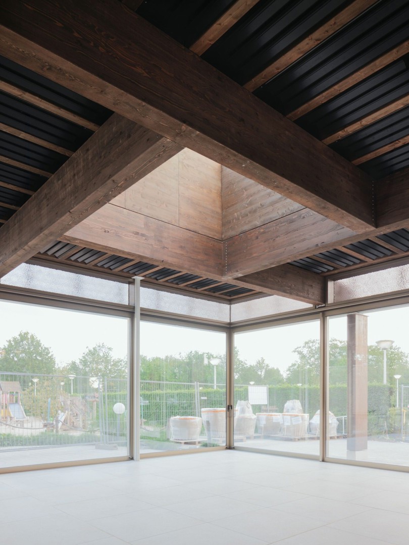 Par leur flexibilité, leur adaptabilité et le fait que les choix structurels ont permis de réaliser des économies de matériaux, les deux pavillons respectent plusieurs principes de la construction circulaire. Mais ils peuvent également être qualifiés de circulaires pour une autre raison importante : leur structure peut être démontée grâce à des connexions réversibles en bois et en aluminium anodisé.
