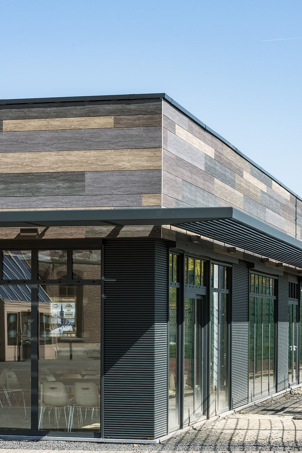 C’est cette hétérogénéité qui a incité l’architecte à choisir les panneaux de bardage Rockpanel® Woods imitation bois pour les façades, afin de mieux intégrer le nouveau bâtiment dans son environnement direct. « Le bardage rappelle une certaine ruralité par son aspect bois et sa volumétrie très simple », continue Michel Meyrant.