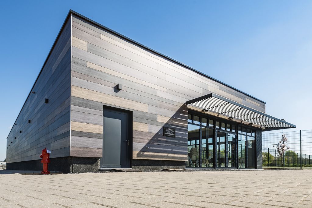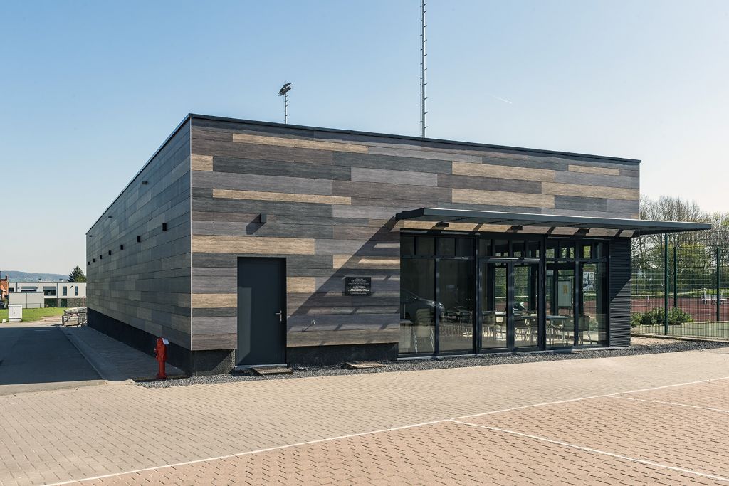 Les panneaux Rockpanel® Woods combinent les avantages et la façonnabilité du bois avec la durée de vie et la solidité de la pierre. Ils sont fabriqués à partir de basalte naturel, une roche volcanique durable et disponible en abondance dans la nature, dont les fibres sont amalgamées à l’aide d’un liant organique. C’est cet assemblage particulier qui est à l’origine des propriétés uniques de tous les produits Rockpanel®. Les panneaux de revêtement extérieur sont recouverts de 4 couches d’enduit de qualité supérieure, en phase aqueuse, qui garantissent la longévité de leur aspect. Cette gamme de produits bénéficie d’une couche de finition protectrice supplémentaire. Dans le cadre du hall sportif, quatre coloris ont été utilisés : Ceramic oak, Carbon oak, Rhinestone oak et Slate oak.
