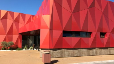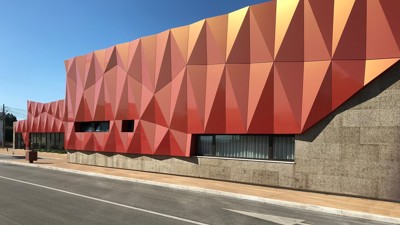 Atelier Data a su capturer l'essence du feu dans leur conception. Les mouvements des flammes, la lumière dansante, les ombres tourbillonnantes et la chaleur rayonnante ont été traduits en architecture. En tout, 1 100 m² de panneaux triangulaires ALUCOBOND® en spectra Cupral ont été utilisés. Ces panneaux sont inclinés à différents angles et disposés en rangées de hauteurs variées, créant un paysage tridimensionnel. Le jeu de lumière et d'ombre sur les façades orangées crée un motif polygonal qui change en fonction du point de vue et de l'heure de la journée.