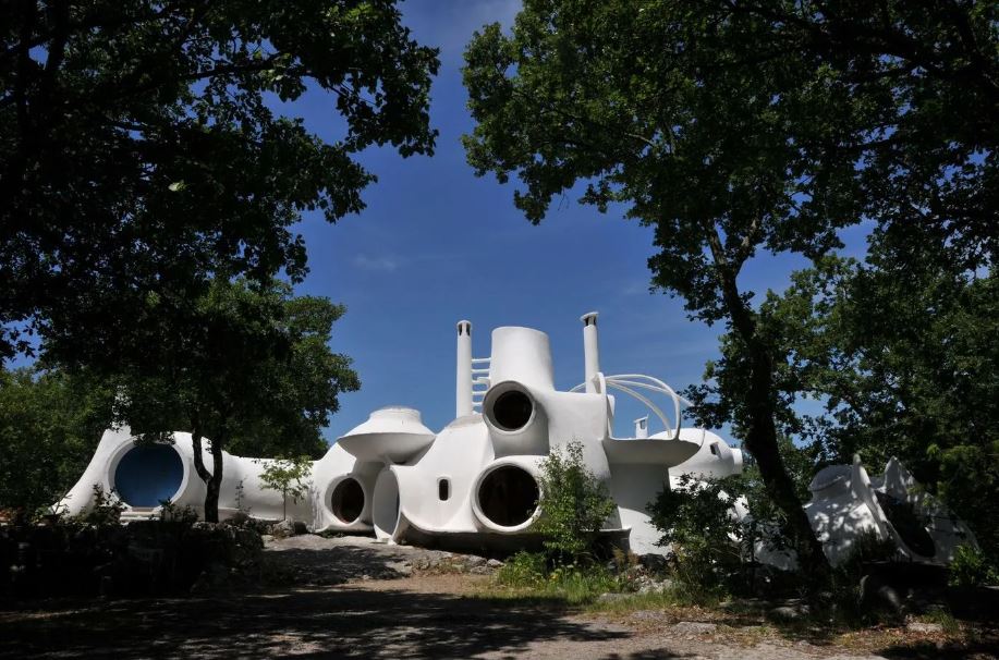 Cette maison-bulle de 156 m² offre une expérience d’habitation unique. Dès l’entrée, le visiteur est accueilli par un séjour où le passe-plat relie la cuisine. Les banquettes, étagères et une grande partie du mobilier sont façonnés à la main, reflétant les parois intérieures et les alvéoles en cascade. L’ensemble est agrémenté de mosaïques et sculptures colorées, présentes aussi bien à l’intérieur qu’à l’extérieur.