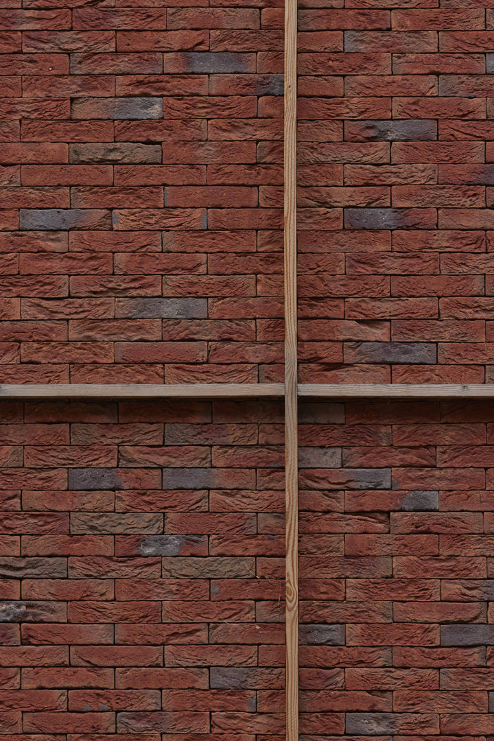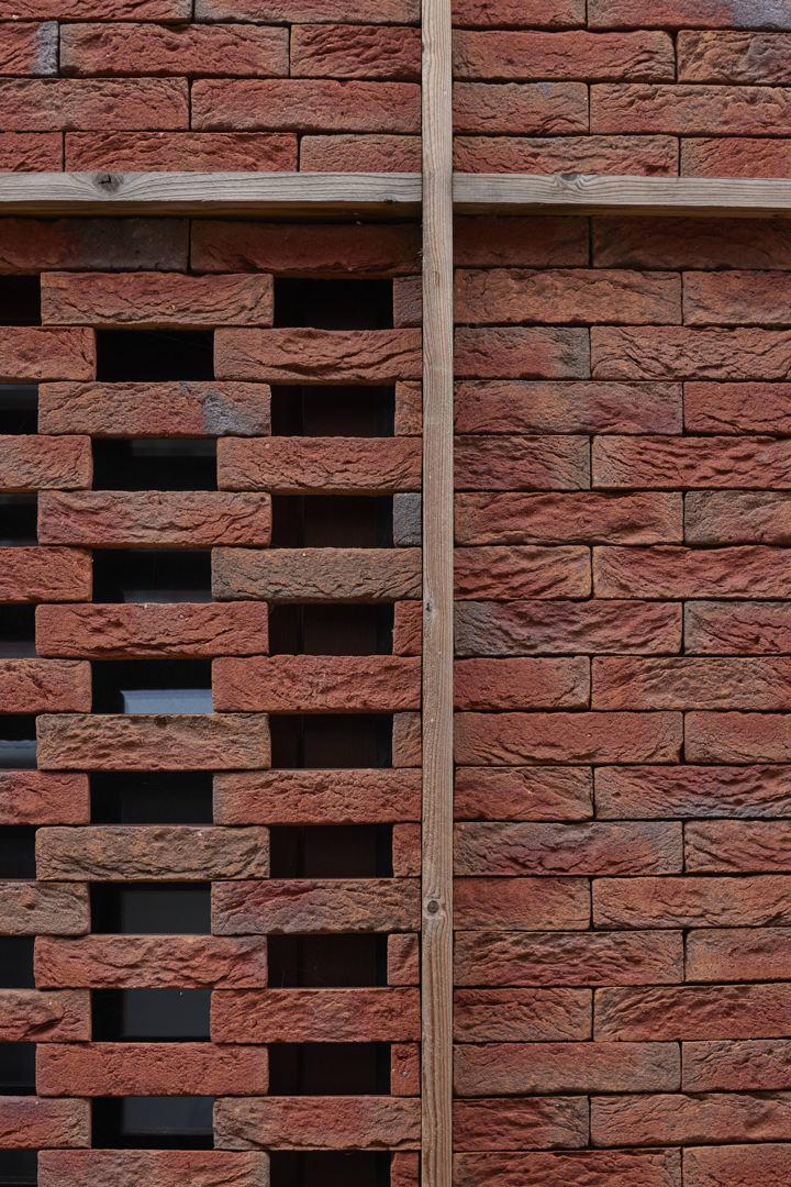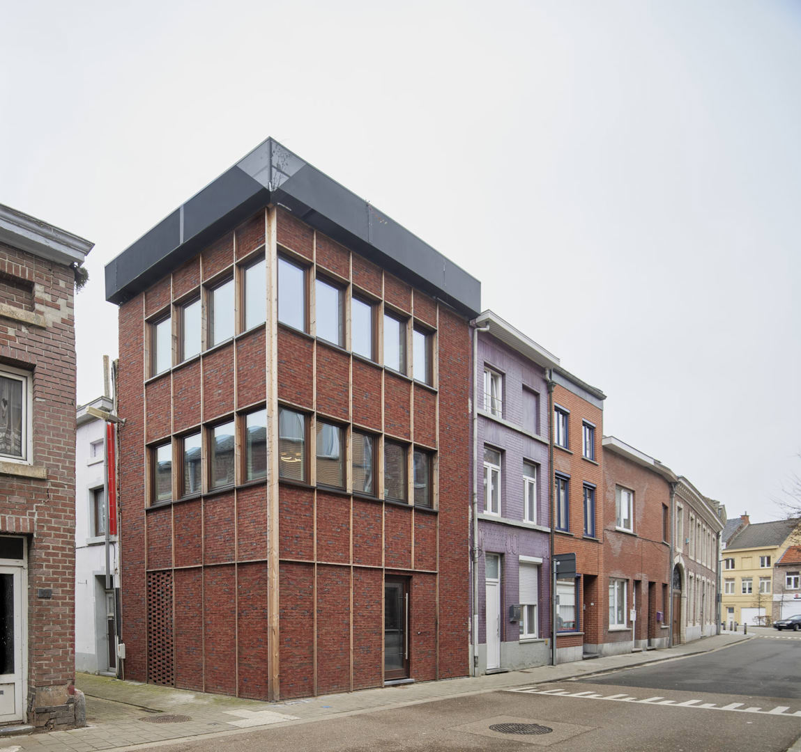 Le nouveau volume s'insère entre les structures existantes et se distingue par sa simplicité. Les deux façades très similaires terminées par des bandes de briques Vandersanden - certes collées - forment le nouvel épicentre de la rue. Une articulation de cadres en bois confère aux surfaces de la façade un rythme urbain, par analogie avec les bâtiments voisins. Pour donner au rez-de-chaussée l'intimité nécessaire, un claustra de lamelles de brique a été placé devant les fenêtres. Les deux fenêtres en bandeau horizontal dominent la façade et suivent l'articulation verticale, permettant une alternance subtile des parties ouvrantes et fixes.