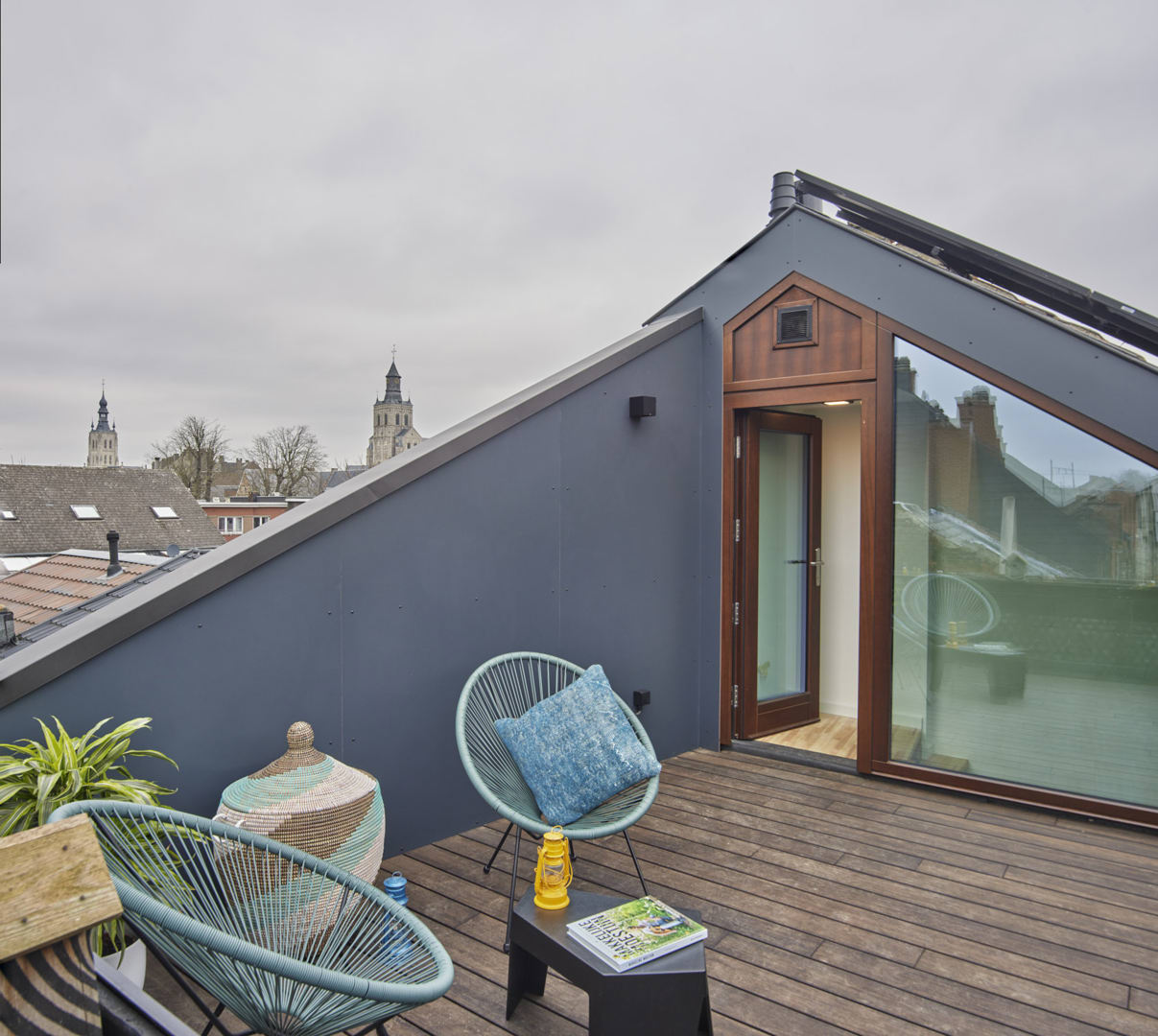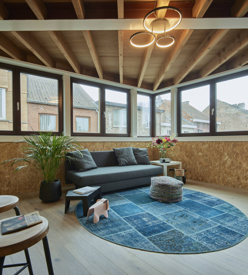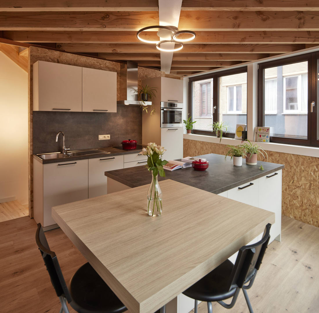 Outre l'ossature en bois, les panneaux OSB et les fibres de cellulose, les fenêtres en bois, les ardoises du toit et les panneaux Rockpanel vissés sur la terrasse de toit, composés à 50 % de matériaux recyclés et eux-mêmes recyclables, sont également des exemples de matériaux de construction écologiques et/ou circulaires.