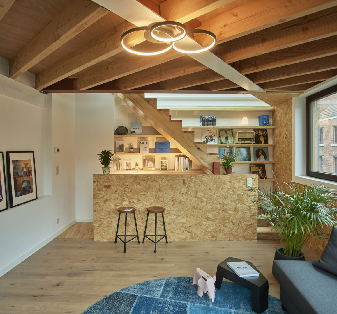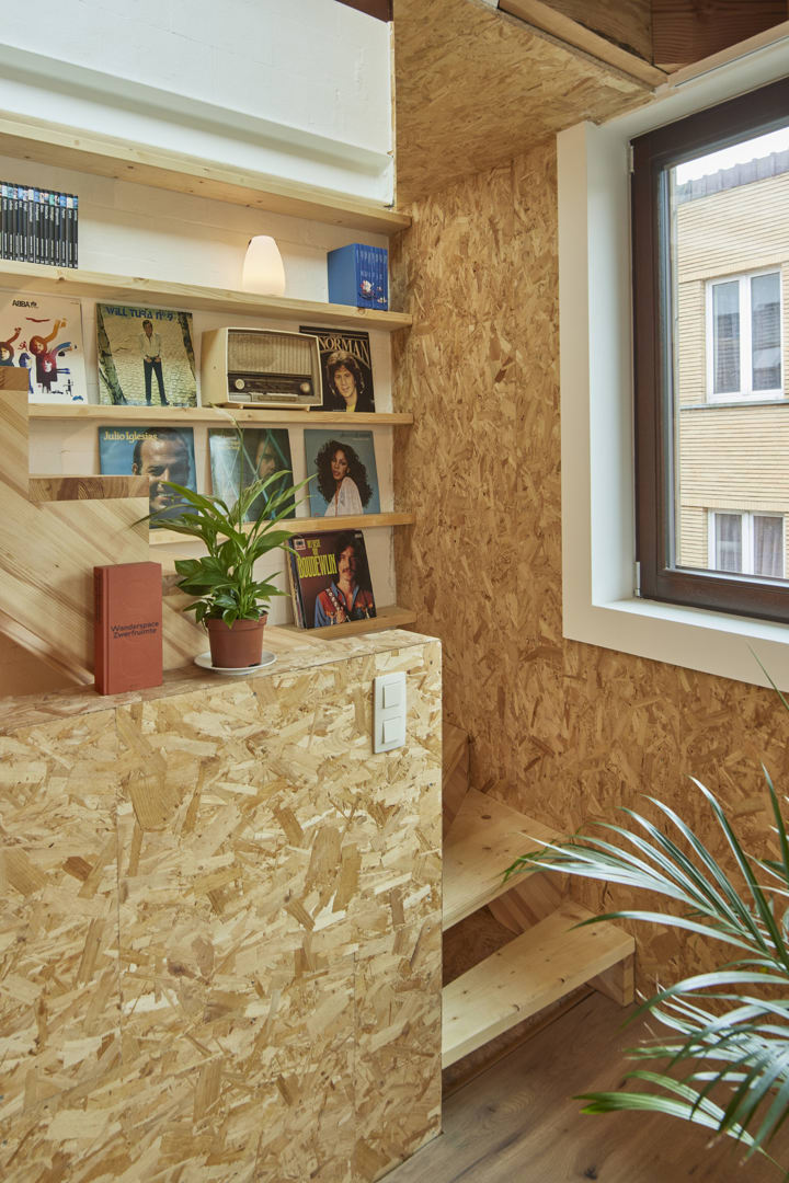 Les problèmes de stabilité mentionnés plus haut ont balayé les plans visant à travailler avec une simple charpente en bois et ont contraint AST77 à opter pour une structure plus solide. La charpente en bois a été complétée par une charpente métallique et des cloisons en béton. Le squelette en acier, qui sert de colonne vertébrale rigide pour assurer la stabilité des propriétés adjacentes et ancrer la structure en bois, a été conçu pour être démontable. La structure combinée acier-bois a été isolée avec des fibres de cellulose et comporte trois niveaux reliés par un escalier compact. Pour ne pas hypothéquer les chances de réutilisation potentielle, le plus de matériaux possibles ont été laissés visibles et non-traités, comme l’OSB pour les cloisons intérieures par exemple.