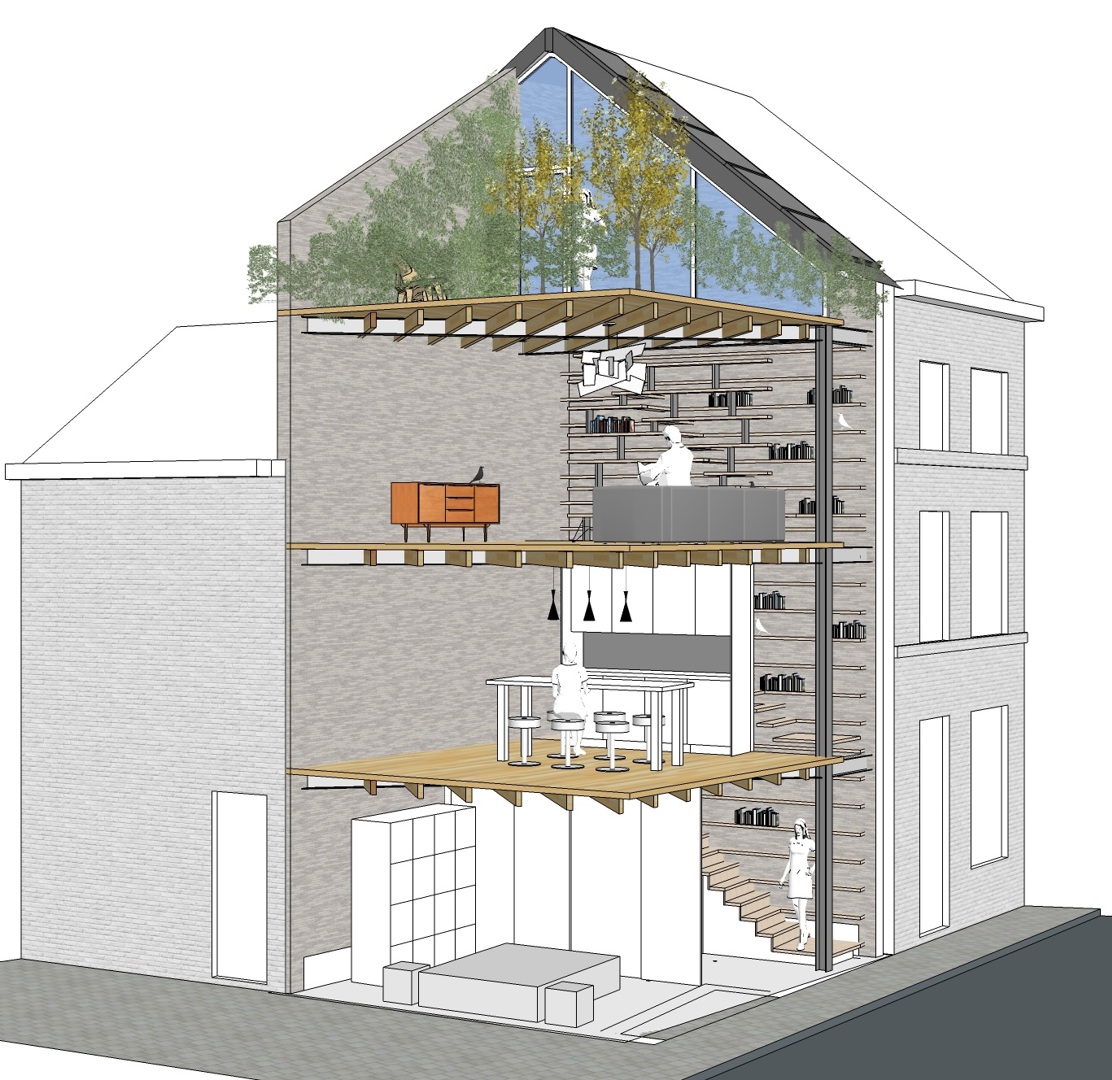 Les architectes d’AST77 se disent fermement convaincus par la superposition intelligente des fonctions et des espaces, en ce qui concerne leur adéquation aux besoins de la vie urbaine. En installant les fonctions techniques et une chambre à coucher compacte au rez-de-chaussée, plutôt sombre, les niveaux supérieurs, plus lumineux, ont pu être conservés pour les espaces de vie. La cuisine et le salon se trouvent respectivement aux niveaux 1 et 2, et tout en haut, aussi loin que possible de l'agitation de la ville et inondé de soleil, se trouve le toit-terrasse fermé, avec un large bac à plantes et à légumes en guise de garde-corps et de tampon vert contre l'agitation en contrebas.