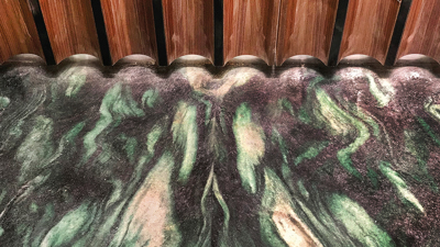 Depuis l’entrée, les visiteurs sont entraînés vers la Grande Salle, longue de 22 mètres, haute de 6 et coiffée de deux dômes parés de mosaïques en pierre taillées à la main dans un dégradé de couleurs. Les murs de cet espace à l’échelle du «Vatican» sont en béton brut, et ponctué de panneaux de soie moirés recouverts de verre dans un rouge cardinal lumineux. Le sol en pierre est un chef-d’œuvre de l’artisanat italien. 15 types de marbres différents s’associent géométriquement dans une gamme de couleurs allant du jaune intense au rouge, en passant par l’ivoire et les crèmes et blanc nacré, le bleu, les noirs et gris intensément veinés.