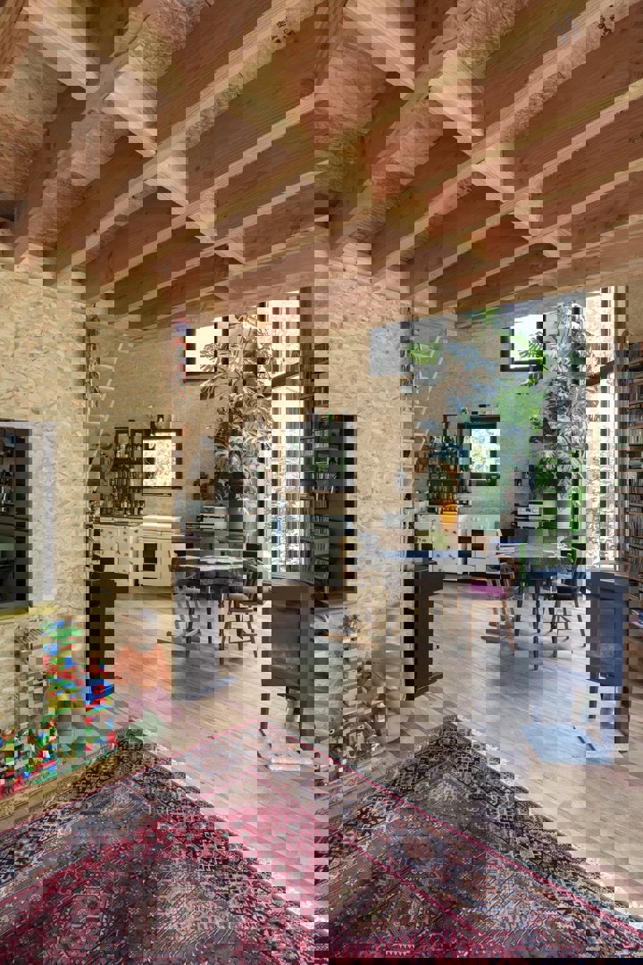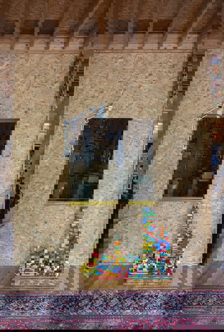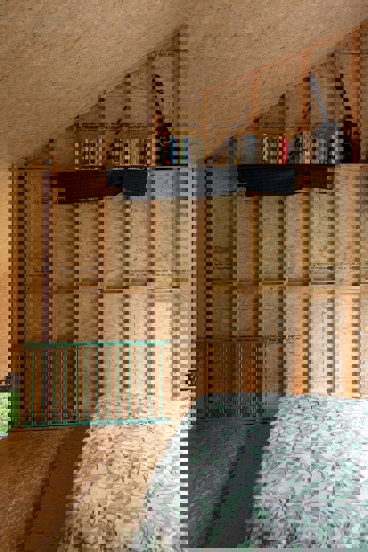 La maison à ossature bois est composée à 100% de matériaux bioécologiques. Par exemple, la structure en bois a été revêtue de planches d'écorce sur des panneaux en fibre de bois et les finitions côté intérieur ont été réalisées avec des panneaux en OSB. Les fenêtres sont également en bois et le toit est constitué de panneaux de fibres de bois, recouverts avec un revêtement de plaques de fibrociment. Comme la toiture et les façades, le plancher a été isolé avec des panneaux de fibres de bois. Les propriétaires ont délibérément meublé la cuisine et la salle de bains avec des matériaux recyclés. En choisissant des matériaux bioécologiques, la maison n'est pas seulement recyclable, mais presque biodégradable.