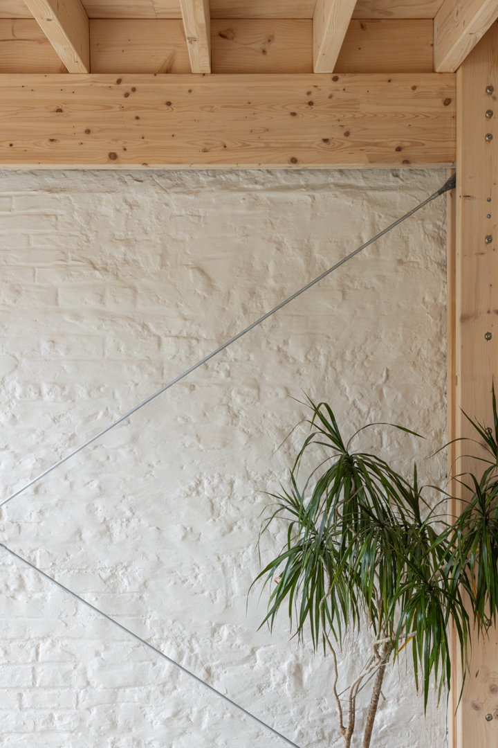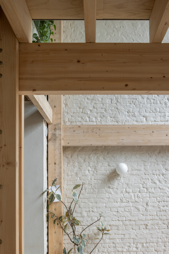 Le projet de rénovation est un bel exemple de (re)construction circulaire. Non seulement par l'utilisation du bois, matériau renouvelable, mais aussi par la structure de l'extension et de l'annexe, composée de poteaux et de poutres en bois massif avec des assemblages réversibles apparents assurant la démontabilité.