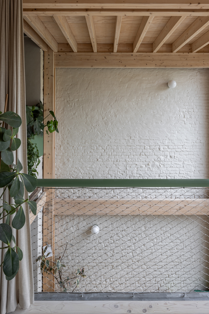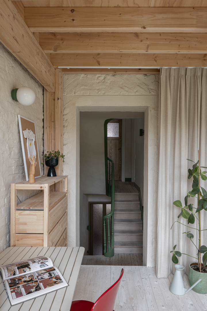 Outre le bois, d'autres matériaux s'inscrivent dans la philosophie de la construction circulaire. Le liège, la laine de bois, le chaux-chanvre et la cellulose ont été choisis comme matériaux d'isolation. La finition est constituée d'un enduit d'argile et de peinture, ce qui garantit une structure saine et respirante. Des granulats de verre cellulaire ont été utilisés pour les fondations, ce qui constitue une alternative durable à la dalle de béton traditionnelle. Le projet est entièrement bioécologique et répond aux exigences de RENOLAB, un programme de subventions qui soutient les projets de rénovation durable.
