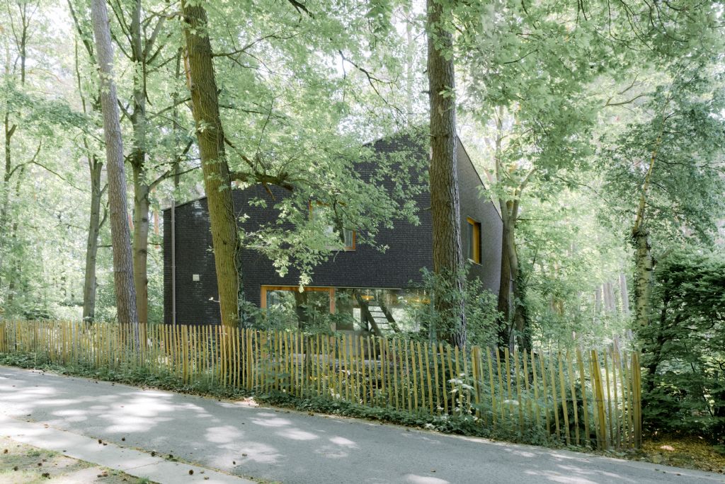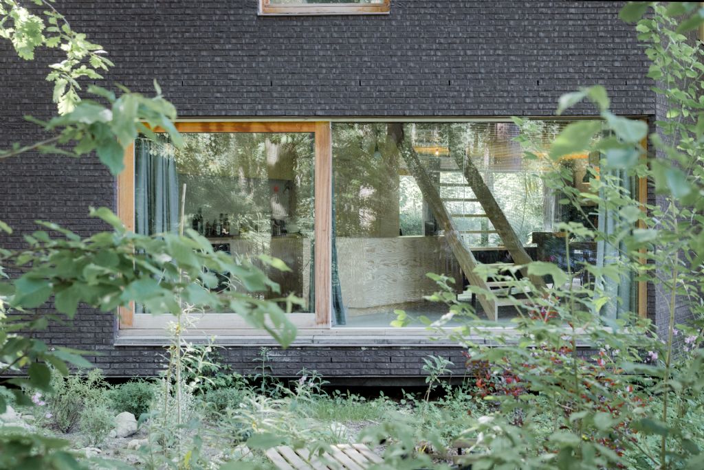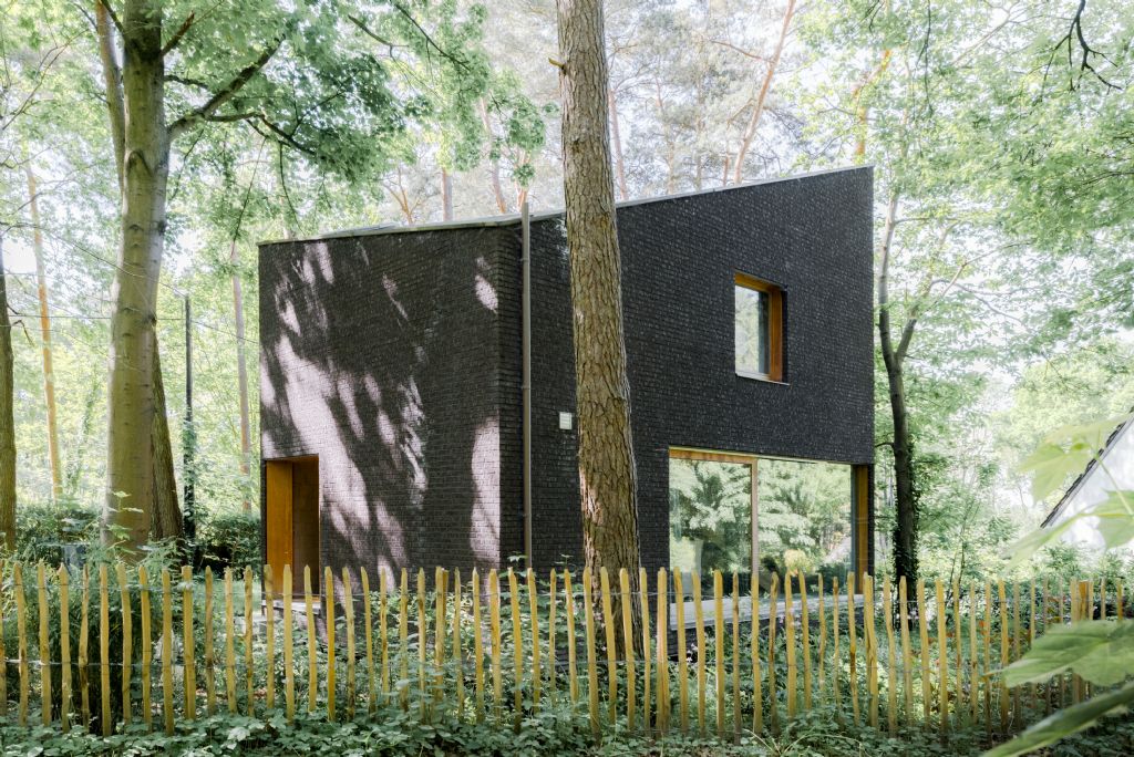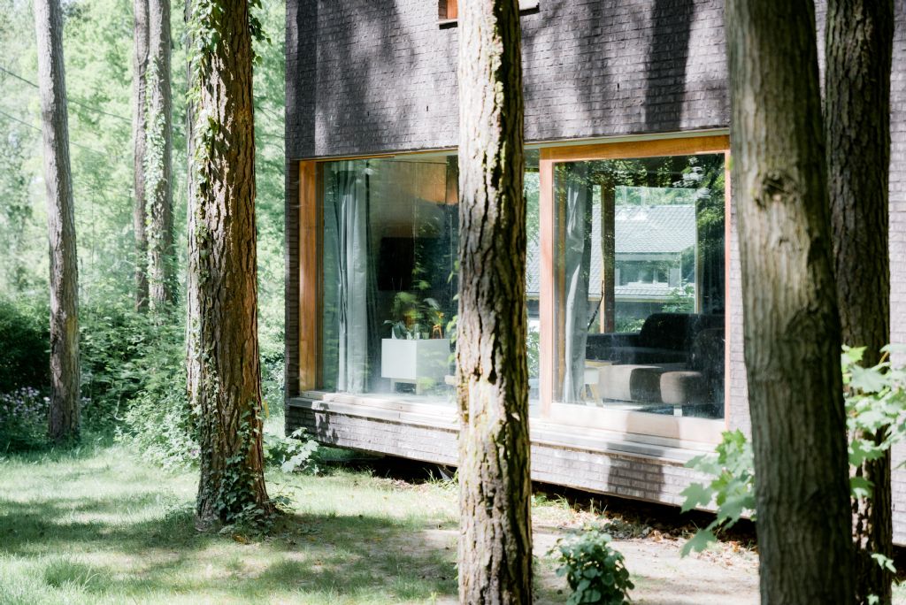 La matérialité des façades donne une expression contemporaine au bâtiment qui se traduit par un volume unitaire. L’enveloppe globale du bâtiment est revêtue d’une brique brun foncé pour fondre le volume dans l’atmosphère du sous-bois. Les façades reçoivent des grandes ouvertures au rez-de-chaussée qui cadrent sur chaque face un tableau différent. Le choix du système structurel en maçonnerie et béton permet de stocker les calories et de les restituer avec un déphasage en jouant sur l’inertie de la construction pour éviter les pics de surchauffe. Le chauffage de la maison est assuré par une pompe à chaleur aérothermique et s’associe d’une ventilation mécanique contrôlée. Cette habitation compacte et efficace en dialogue avec son environnement naturel offre un cadre de vie riche et varié à une famille ayant décidé de quitter la vie urbaine bruxelloise.