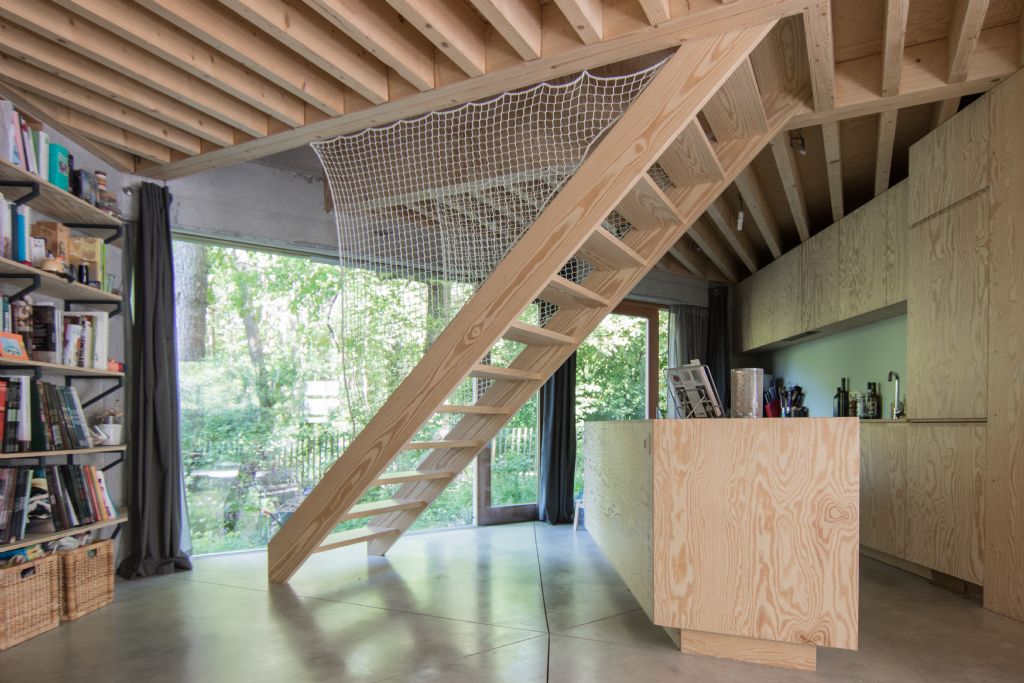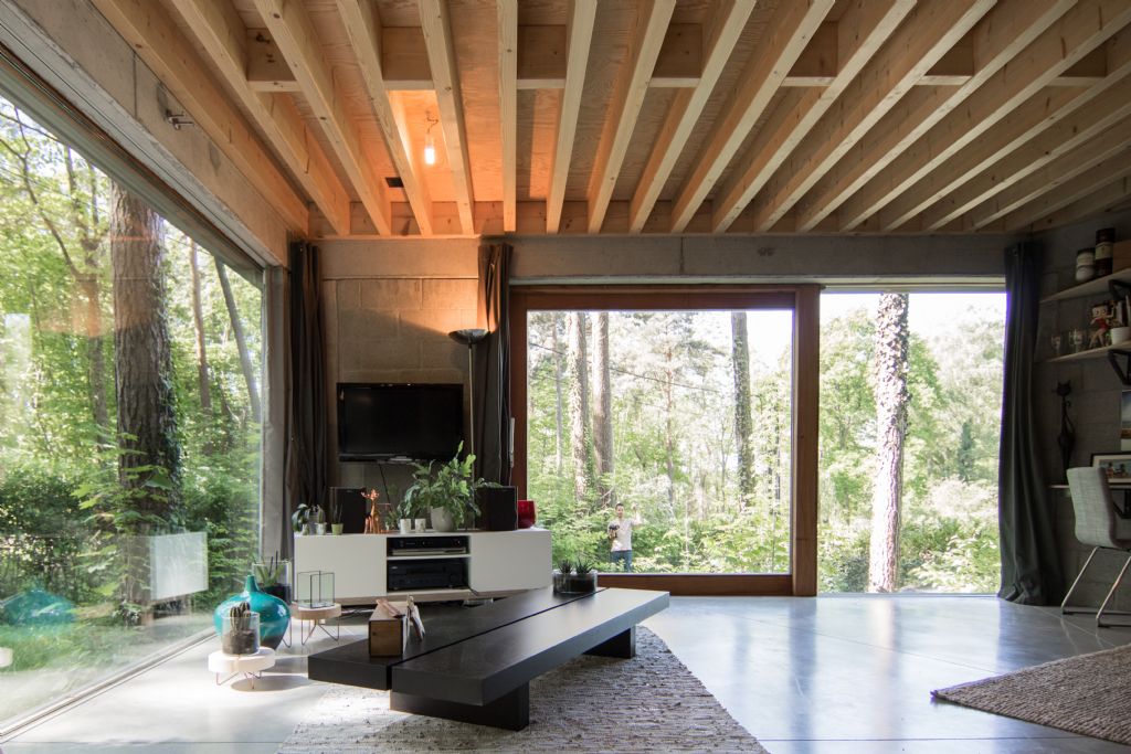 À l’intérieur, les espaces de vie s’enroulent autour d’un noyau technique et profitent d’une orientation et d’un cadrage propre à chacune des facettes du pentagone. Ils sont fluides, ouverts et en contact avec l’extérieur. Les espaces de nuit s’articulent de manière rationnelle et compacte autour de la cage d’escalier. Les matériaux intérieurs sont assumés et révèlent fièrement l’aspect constructif de la maison. Les fenêtres des chambres sont définies à une hauteur telle que la tablette peut faire office de banquette permettant de se poser dans un espace au milieu des arbres. La conception durable du projet propose de tirer parti de son orientation pour ouvrir les espaces de vie vers le sud et l’ouest de manière à profiter des calories « gratuites « en hiver et à la mi-saison tout en veillant à se protéger des risques de surchauffe en été par la présence des arbres.