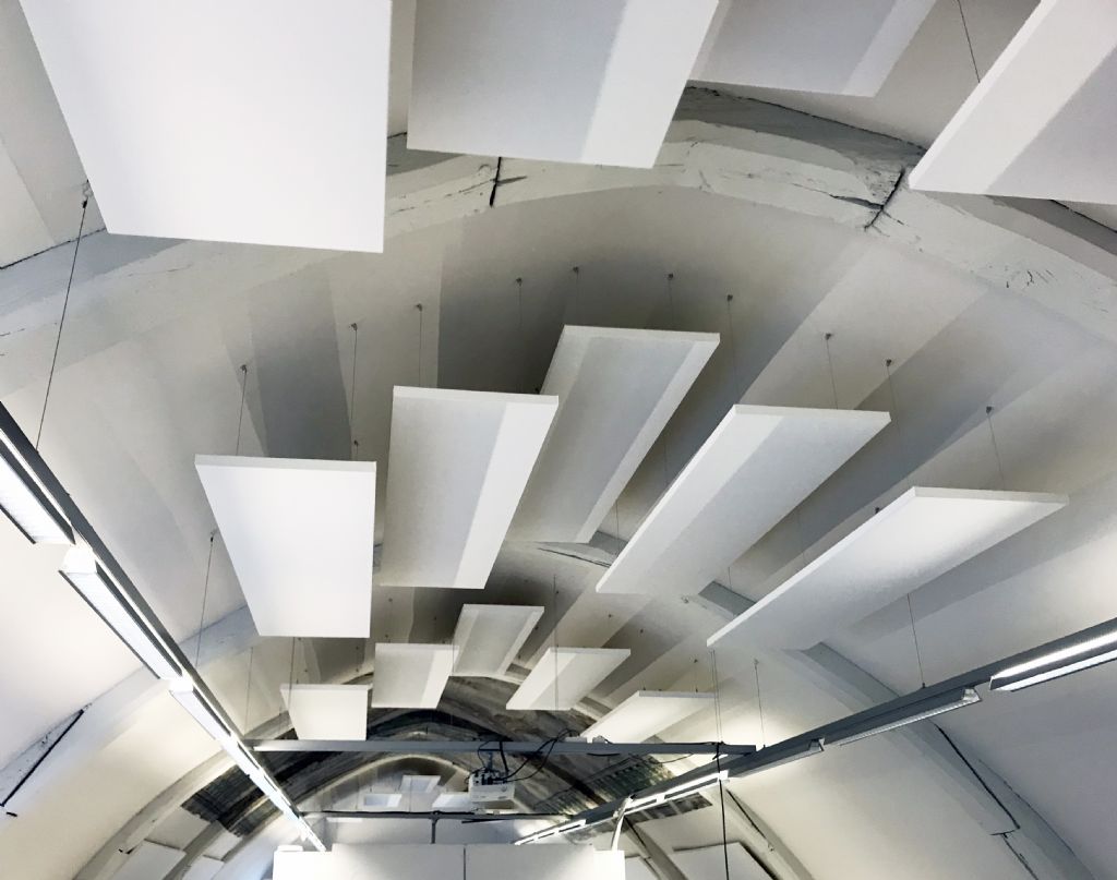 Sur le mur, Dox Acoustics a opté pour des oeillets afin que les panneaux restent amovibles et à une distance minimale du mur pour ne pas les abîmer. Les oeillets sont également idéaux pour une surface légèrement en pente. Sous le plafond incurvé, les panneaux ont été suspendus en chevauchement sur des câbles réglables en longueur. Cela garantit une flexibilité dans la mise en place ainsi que des dommages minimes. L'effet dimensionnel est également beau et s'intègre parfaitement au caractère de la pièce.