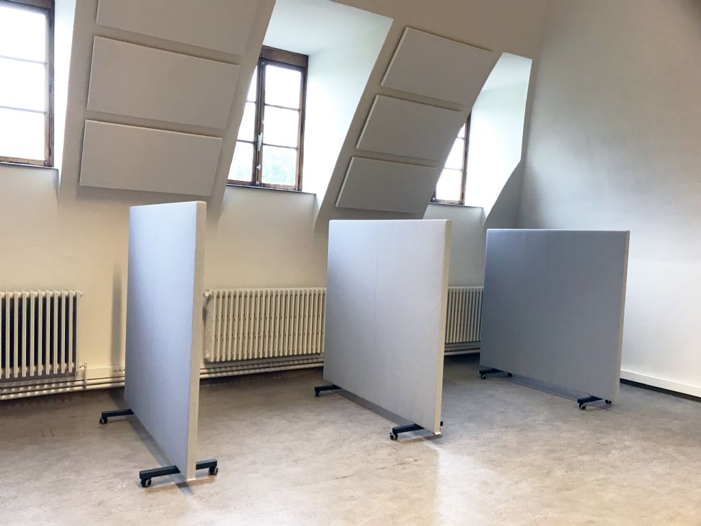 Après concertation avec le client, ce sont les panneaux D-Sound qui ont été choisis. Ces panneaux acoustiques sont recouverts de textile, ont une forte absorption et sont composés de fibres de laine de verre recyclées.