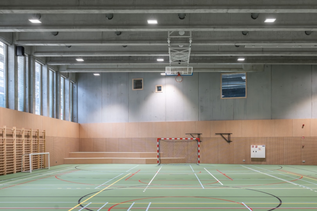 L’un des plus grands défis du projet était de créer autant d’espace utile que possible sur une surface limitée. Le choix d’espaces extérieurs superposés s’est avéré être une solution intelligente. La salle de sport, construite à moitié sous terre, attire l’attention des passants et invite à l’interaction. La cour de récréation verte a été installé sur la toiture de la salle de sport, et les zones extérieures, dispersées sur différents niveaux, offrent un espace pour diverses activités sportives ou de loisirs.