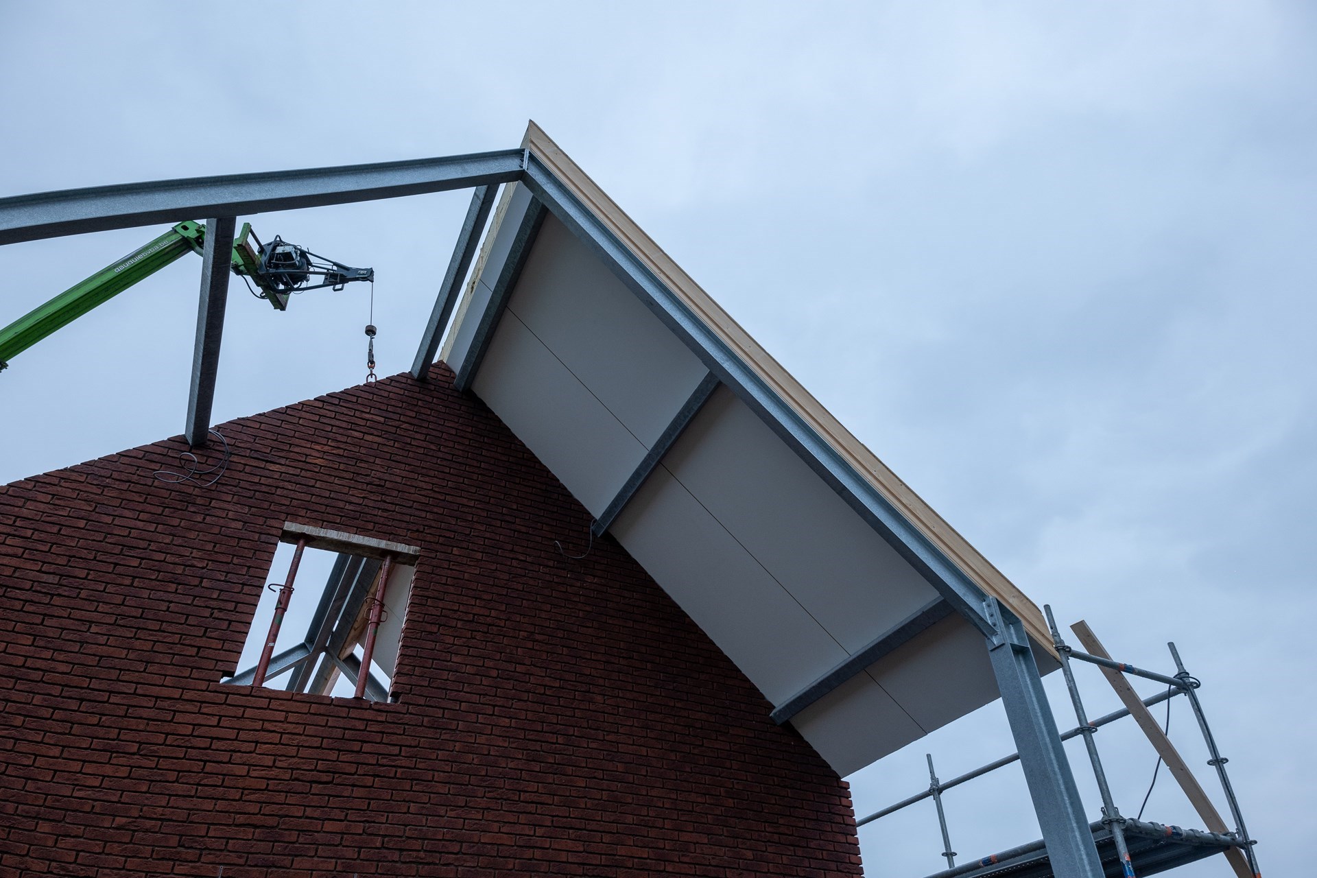 Le constructeur a donc imaginé une structure en acier comme base, avec une toiture en pente constituée de panneaux Usystem. Tom Ghyselen : « Nous plaçons la structure en acier en une bonne semaine. La pose des panneaux de toiture ne prend ensuite que deux jours. La construction d’une maison étanche au vent et à l’eau en seulement douze jours au lieu des neuf semaines habituelles ? Ça fait une belle différence ! »