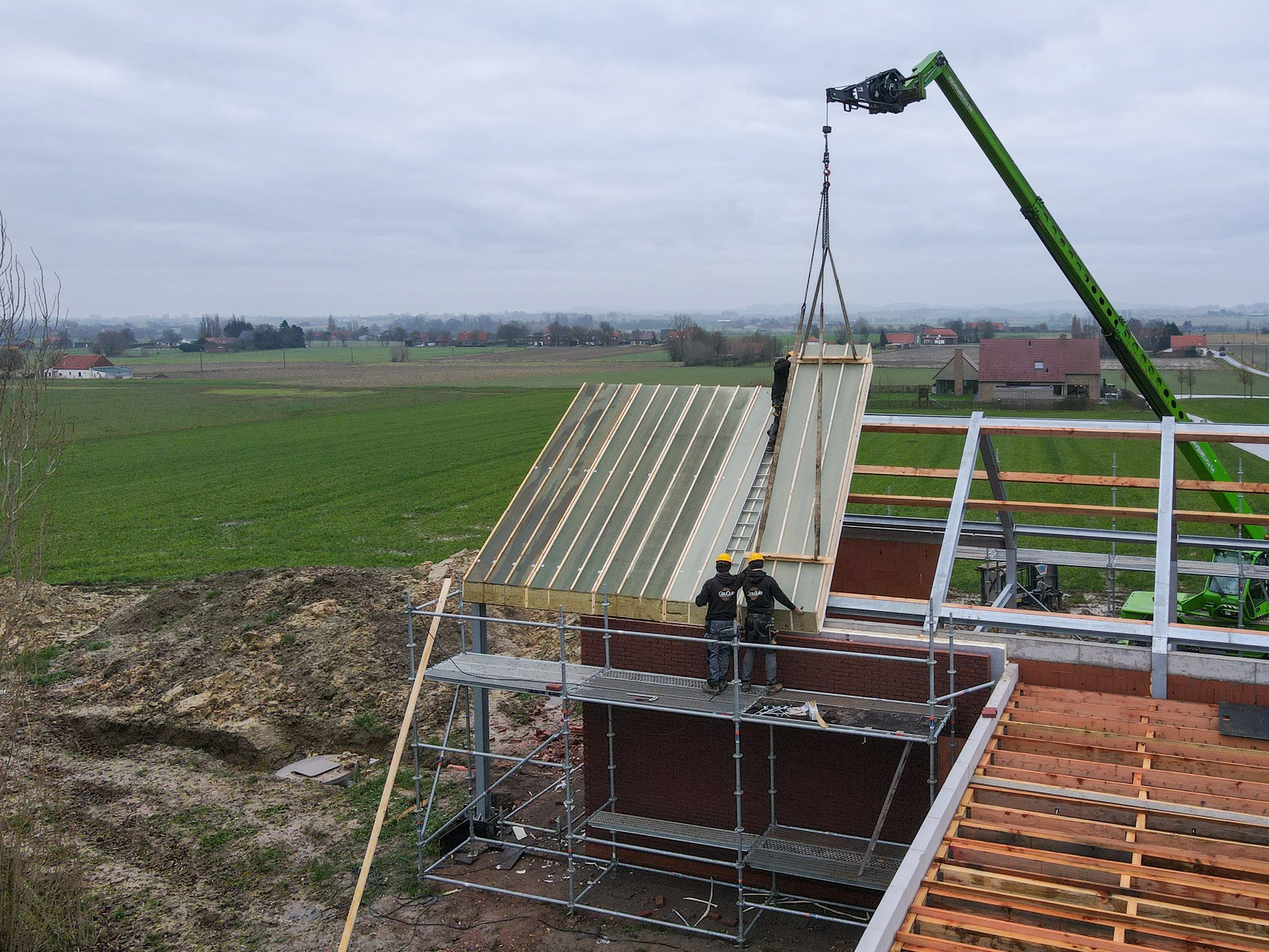 En plein cœur de la campagne de Poperinge (Flandre occidentale), une nouvelle maison familiale surgit à toute vitesse du sol ! Choisir une construction en acier et des panneaux de toiture Usystem, c’est en effet obtenir une maison étanche au vent et à l’eau en deux semaines à peine. Une combinaison intelligente qui permet de gagner du temps, mais aussi de l’argent !
