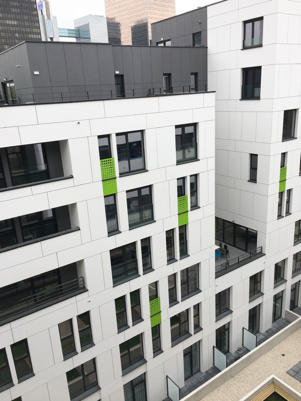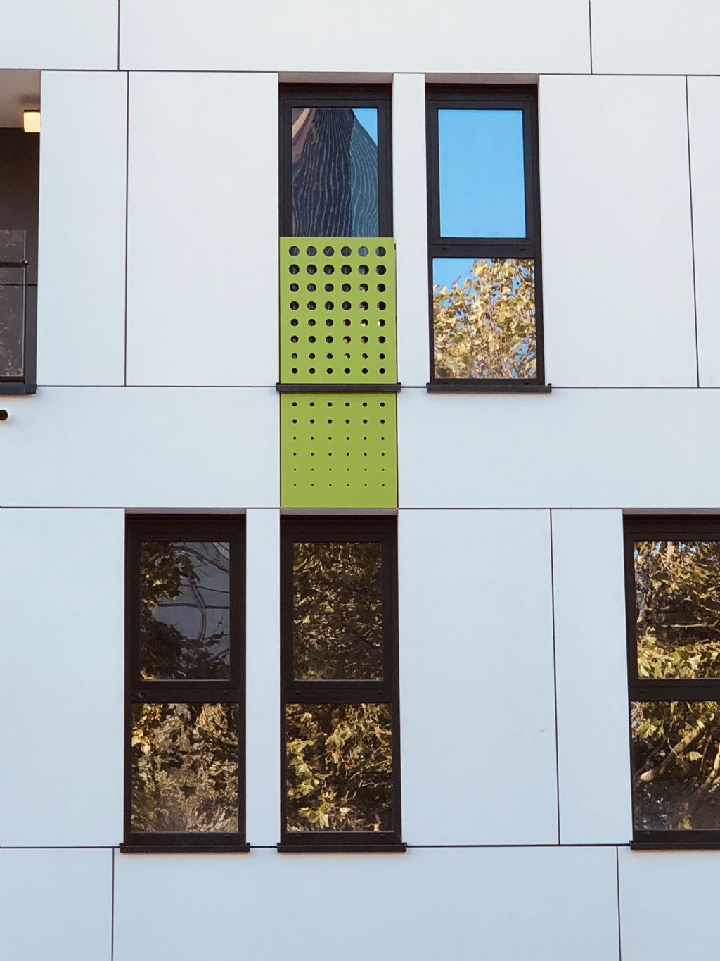 Les façades se veulent à la fois lumineuses et dynamiques. Les panneaux fibro-ciment de couleur blanche et gris anthracite tranchent avec la couleur noire des menuiseries extérieures. Cette harmonie de couleur est rehaussée de panneaux de couleur vive qui ponctuent et rythment les façades, à la manière d’une partition musicale. Les terrasses, en saillie ou en creux, créent autant d’événements dans ces façades de grand longueur