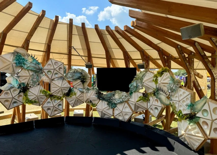 Pour cette édition de Glastonbury, la structure est décorée de feuilles de bioplastique translucides et gélatineuses, manipulées pour ressembler à des vagues d'écume, à des pousses d'algues et à des écailles découpées au laser et suspendues comme des mobiles.