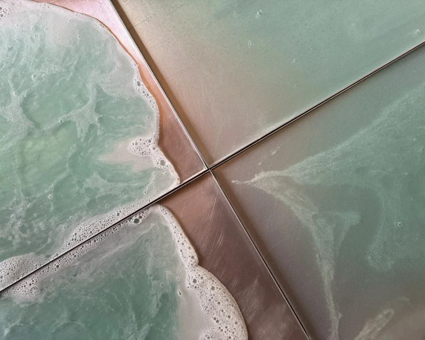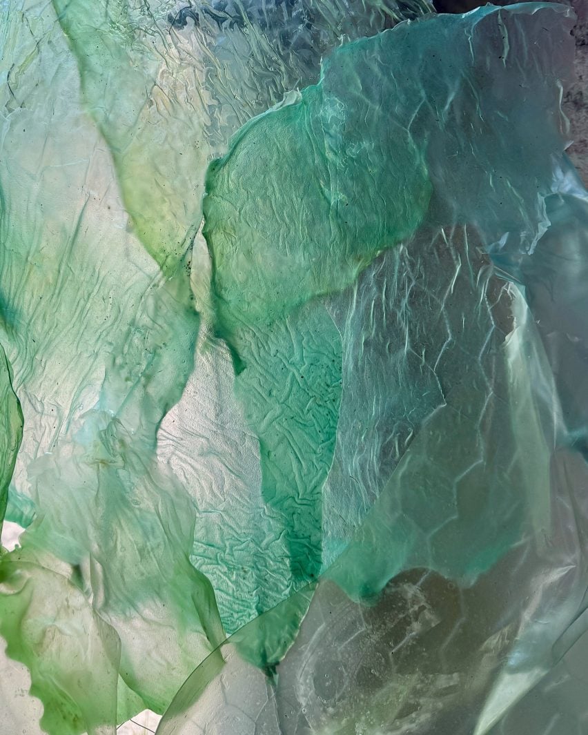 Le bioplastique présenté dans l'installation est fabriqué à partir d'algues rouges et brunes provenant d'un peu partout en Europe et du Royaume-Uni. Elles sont mélangées à des pigments végétaux comme le chou et la betterave pour la couleur, voire à des pigments minéraux qui leur confèrent une opalescence nacrée.