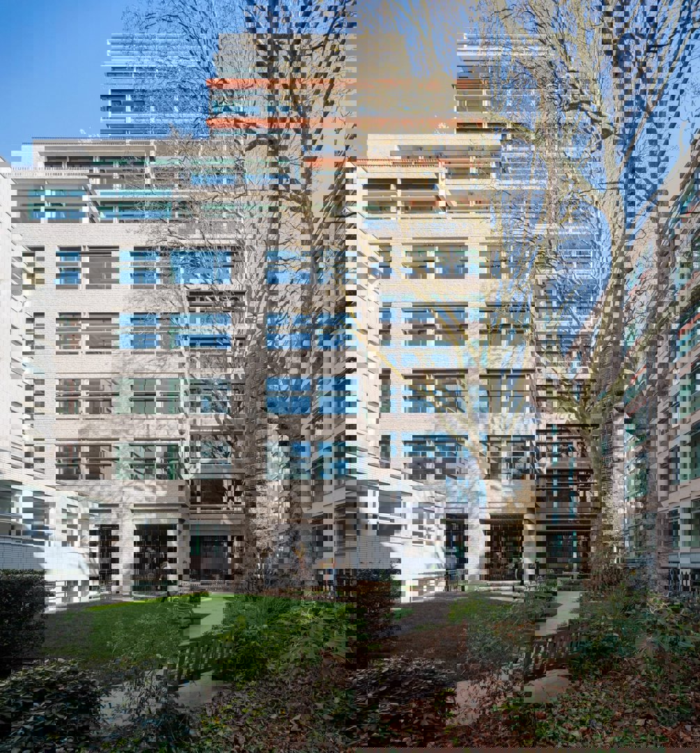 Afin de s'harmoniser avec les bâtiments voisins, la plupart des façades de la tour donnant sur la rue ont été recouvertes de fenêtres et de bandes de béton rouge, tandis que les façades donnant sur le jardin ont des surfaces grises et une ligne de toit en gradins.