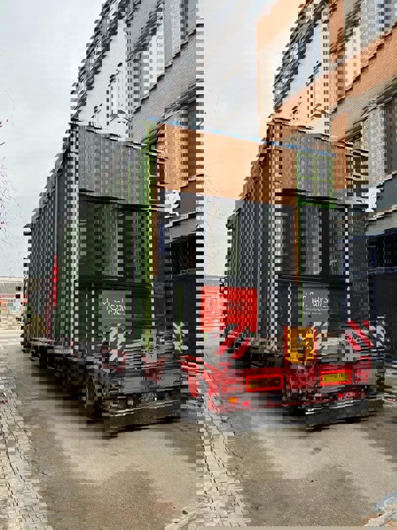 Il n'a fallu que quatre mois à Mobble pour construire une maison Mobble, dans leur atelier. Kristof de Jaeger : "De cette façon, nous éliminons les coûts supplémentaires et les pertes de temps et nous travaillons bien plus rapidement sur le chantier. En quinze jours, les fondations et les lignes de services publics sont installées sur le site, puis la maison est transportée, mise en place à l'aide d'une grue et raccordée aux infrastructures. Ensuite, quelques semaines de finition et la maison est prête".