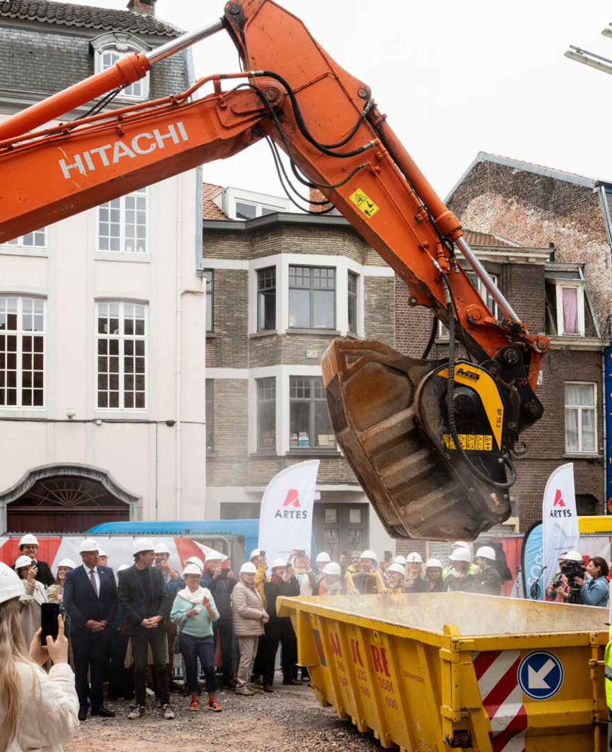 L'entrepreneur général Artes Depret-Artes Woudenberg procède actuellement à des travaux préparatoires sur le site de la Drabstraat, où l'on retrouvait autrefois le célèbre grand rouleau de papier toilette. Il s'agit quelques opérations de démolition et de mise en place des fondations. Ces travaux seront suivis d'une étude archéologique et de la couche de construction souterraine. Le prochain point à l'ordre du jour est la construction du bâtiment en bois massif DING. Les bâtiments existants House Leten, Hotel De Coninck et Wing 1992 seront également partiellement restaurés et rénovés.