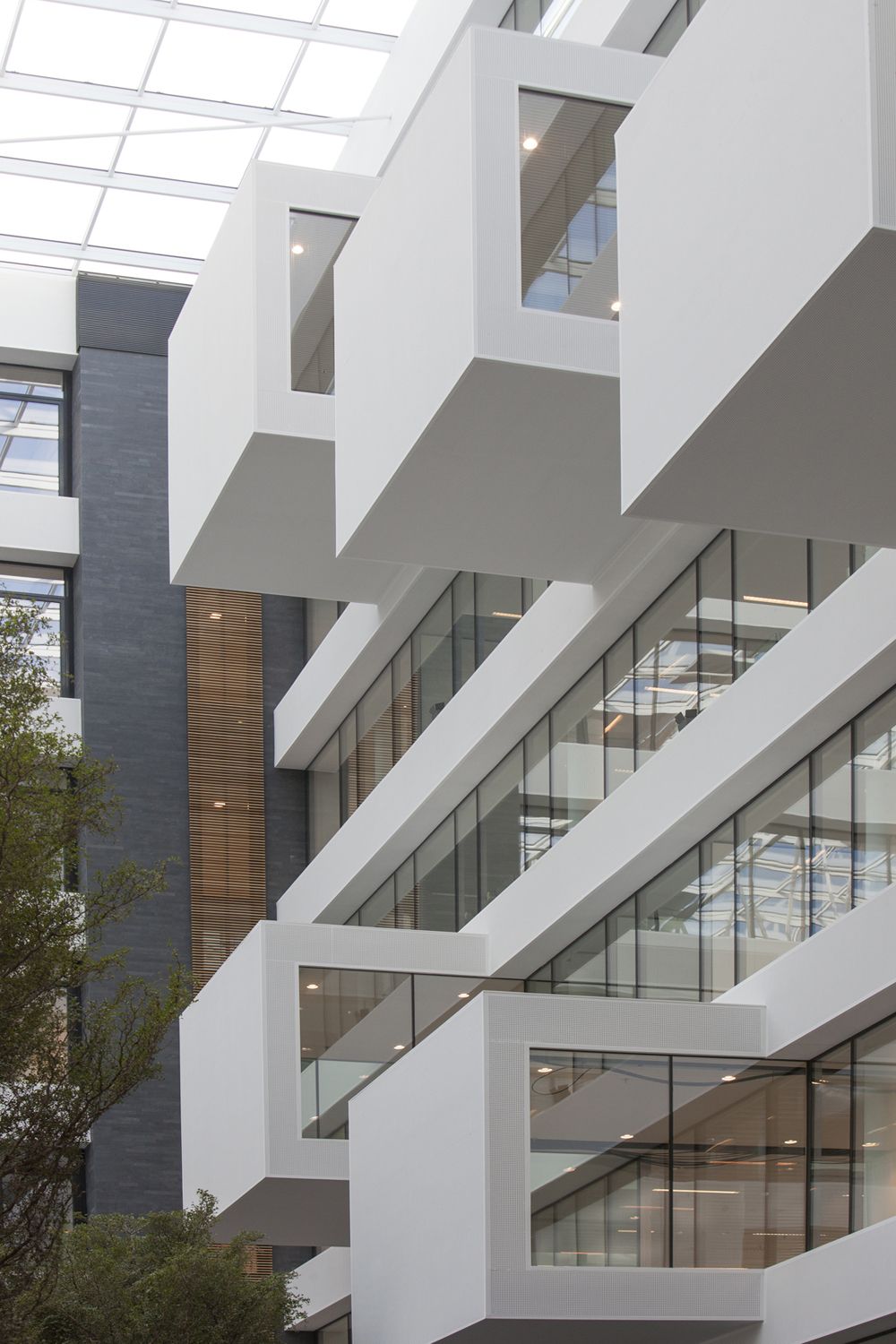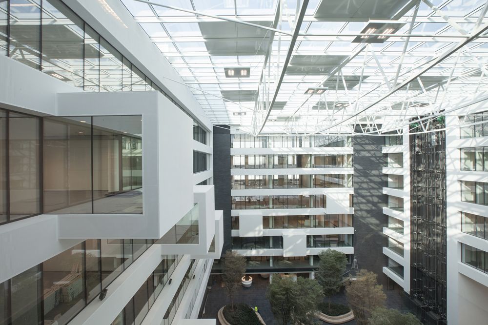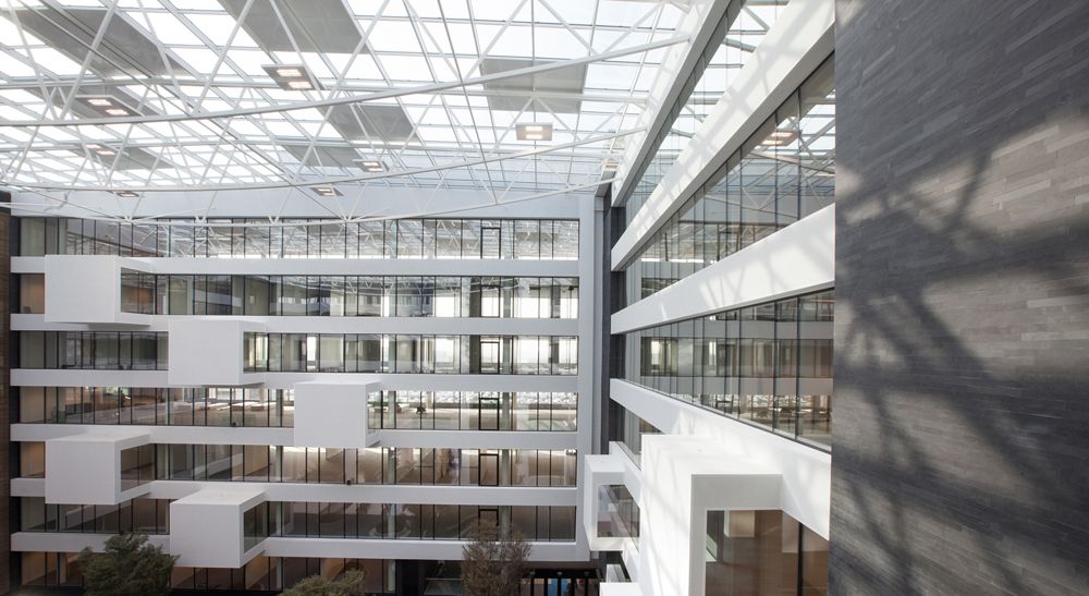 Le bâtiment comprend 32.000 m² de bureaux répartis en quatre ailes, celles-ci encadrant un grand atrium arboré. Ce volume central, zone d’échanges et de rassemblement, concentre diverses fonctions dont la zone d’accueil, le restaurant d’entreprise et un espace polyvalent. Il rassemble également les circulations verticales principales.