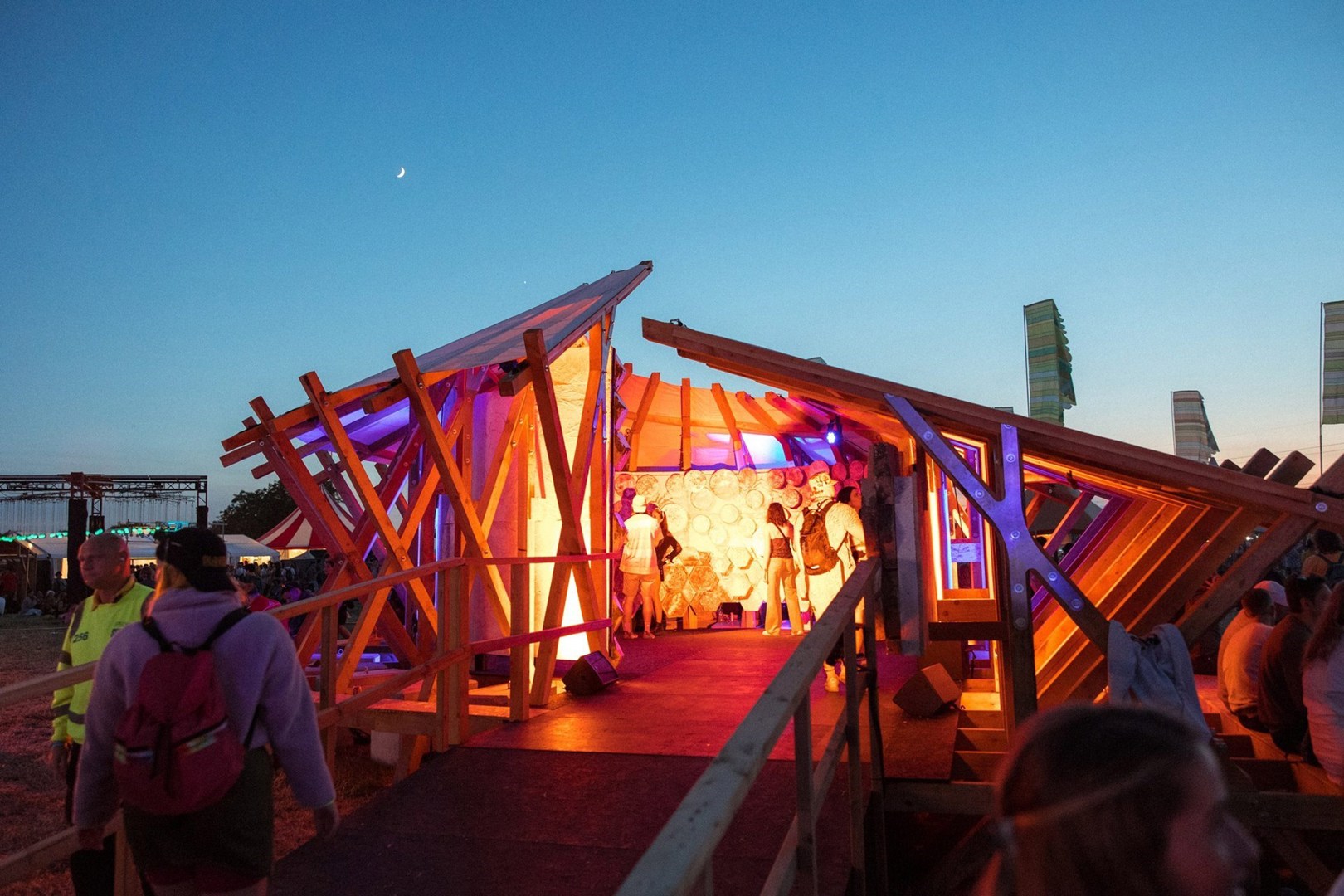 Fixée par des boulons en acier et des plaques de montage, la structure en bois peut être entièrement démontée et emballée à plat afin d'être réutilisée pour les prochaines éditions du festival. Simon Carroll prévoit de ramener le pavillon Hayes à Glastonbury chaque année pour explorer les nouvelles technologies et approches écologiques qui sont appelées à révolutionner l'industrie. Bien que les panneaux isolants à base de mycélium de Biohm soient sur le point d'obtenir l'approbation des autorités de réglementation, Simon Carroll estime qu'il faudra encore développer d'autres matériaux pour les adapter à une utilisation dans la scénographie. Cela s'explique en grande partie par les disparités entre les matériaux qui apparaissent lorsque les panneaux prêts à l'emploi sont coupés et poncés pour créer des formes plus complexes. "Au départ, j'avais imaginé un concept assez différent en termes de style, mais je me suis vite rendu compte que nous n'étions pas tout à fait au point", a-t-il déclaré. "Nous n'en sommes qu'au tout début et cela nous a permis d'avoir un retour d'information et de continuer à développer un produit plus adapté", conclu le scènographe.