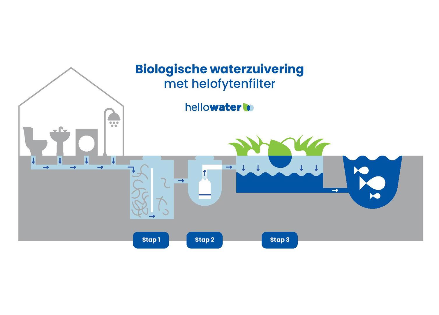 La société HelloWater, réputée pour ses filtres végétaux mobiles lors des festivals, a décidé de résoudre ce problème. Le système d'épuration de l'eau imaginé par HelloWater est lui aussi basé sur les plantes : les eaux usées - noires et grises - sont collectées dans un bassin de pré-sédimentation. Là, les particules solides ont le temps de se dissoudre. La partie liquide s'écoule ensuite dans un puits de pompage, d'où les eaux usées sont injectées dans le système végétal. Le bac à plantes est constitué d'un mélange de lave et d'un mélange de substrat inerte breveté dans lequel les plantes et les bactéries se développent. L'interaction entre les racines des plantes et les bactéries y purifie l'eau de manière écologique. Après le processus de percolation, l'eau retourne dans la nature ou dans un réservoir tampon d'où elle peut être réutilisée, par exemple pour la chasse d'eau des toilettes.