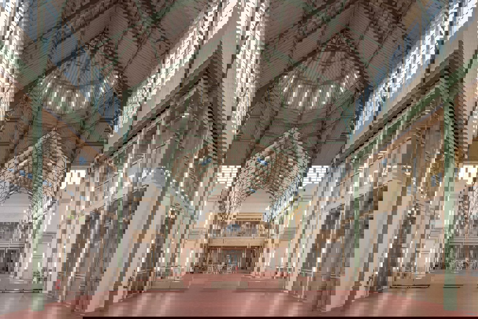 Dans les nouvelles salles, la structure modulaire en bois est visible à côté de la charpente métallique peinte en vert de la structure patrimoniale d'origine, ainsi que des conduits et des gaines de ventilation apparents. Les matériaux utilisés pour le projet ont été collectés dans un rayon de 100 kilomètres autour du site, notamment le bois de peuplier local pour la structure en bois.