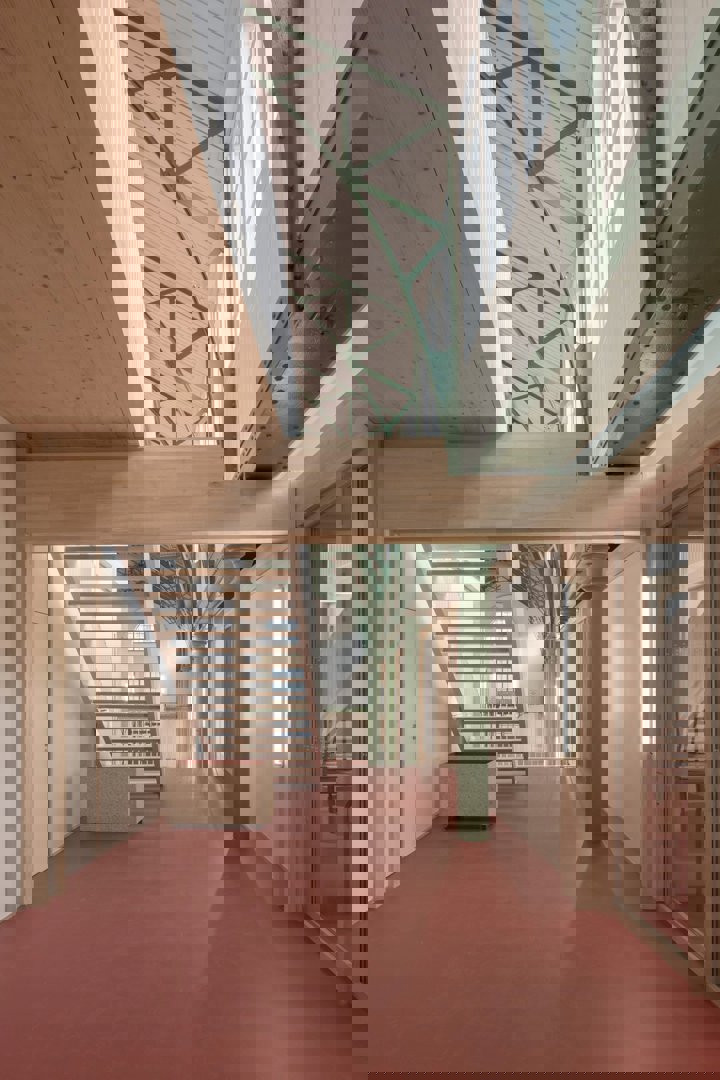 « Une architecture innovante et démonstrative est ici proposée, à travers un projet modulaire et évolutif, conçu pour prendre en compte l'avenir », ajoute-t-elle. Organisée en périphérie du grand espace central du bâtiment, la structure à poteaux et poutres en bois est renforcée par des cloisons conçues pour être facilement reconfigurées afin de répondre aux besoins de l'école.