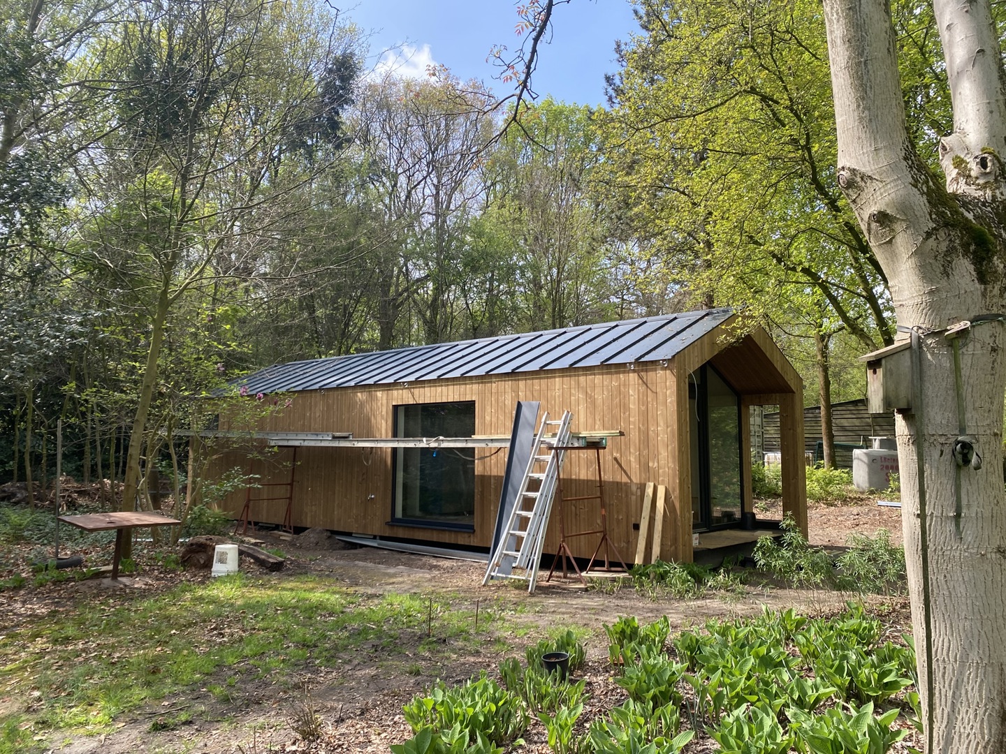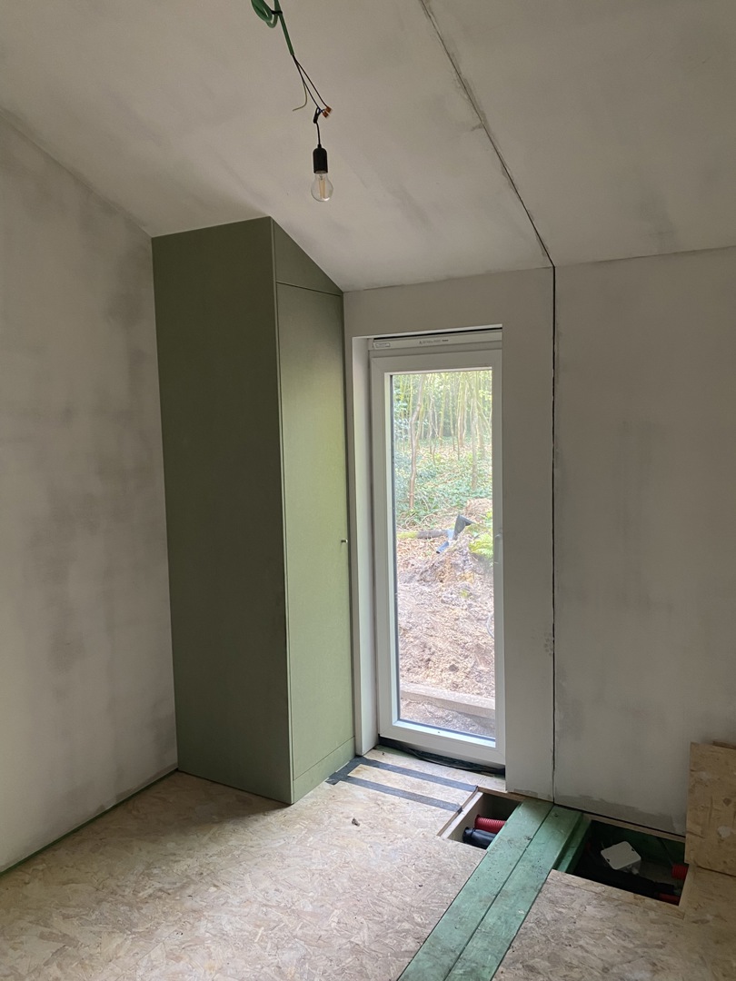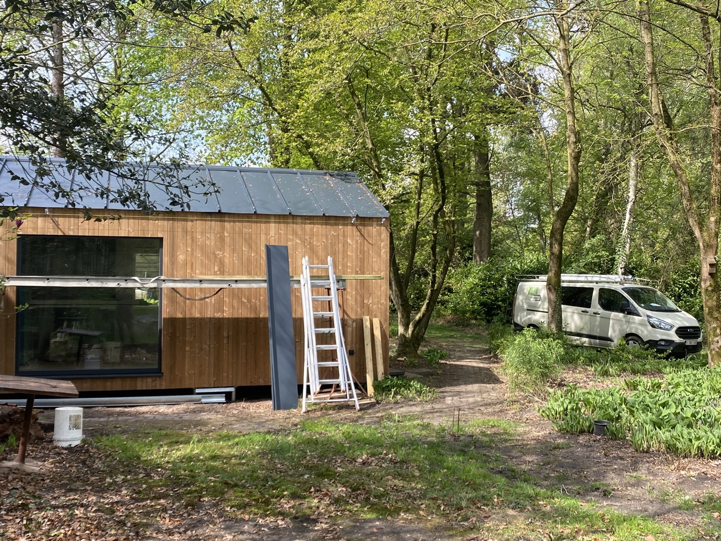 ZET Wonen a construit la maison de campagne pour le couple de retraités dans son propre atelier pendant environ quatre mois, ce qui correspond au délai habituel. Afin de faciliter le transport, la tiny house a été livrée en quatre modules sur le site de construction. Ceux-ci ont ensuite été assemblés sur place. Le sol n'a été posé qu'après l'installation, celui-ci s'étendant sur tous les modules. Les panneaux de toiture n'ont également été posés sur la tiny house qu'une fois celle-ci arrivée à destination, car certains d'entre eux s'étendent également sur deux modules. Comme toujours, les techniques ont été intégrées en atelier.