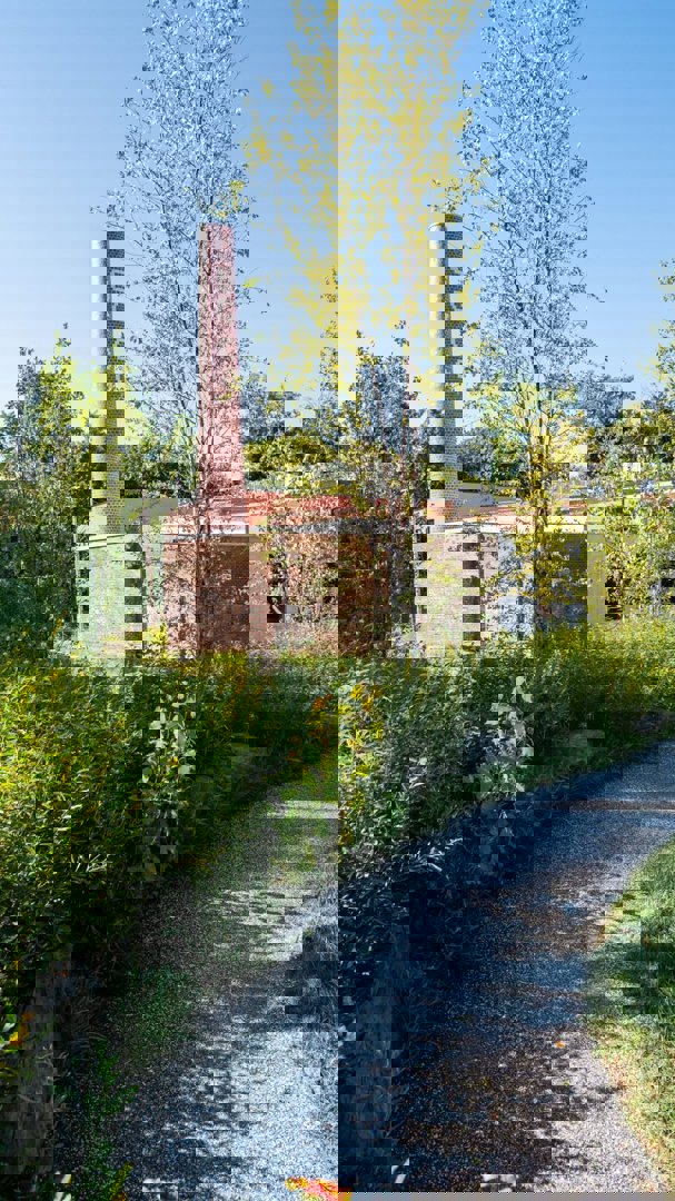 Une cheminée d'évacuation en briques de 15 mètres de haut surplombe les bâtiments et les espaces extérieurs, avec les lettres SGCO (pour Standard Gage Company) peintes sur les briques en référence à son ancienne utilisation.