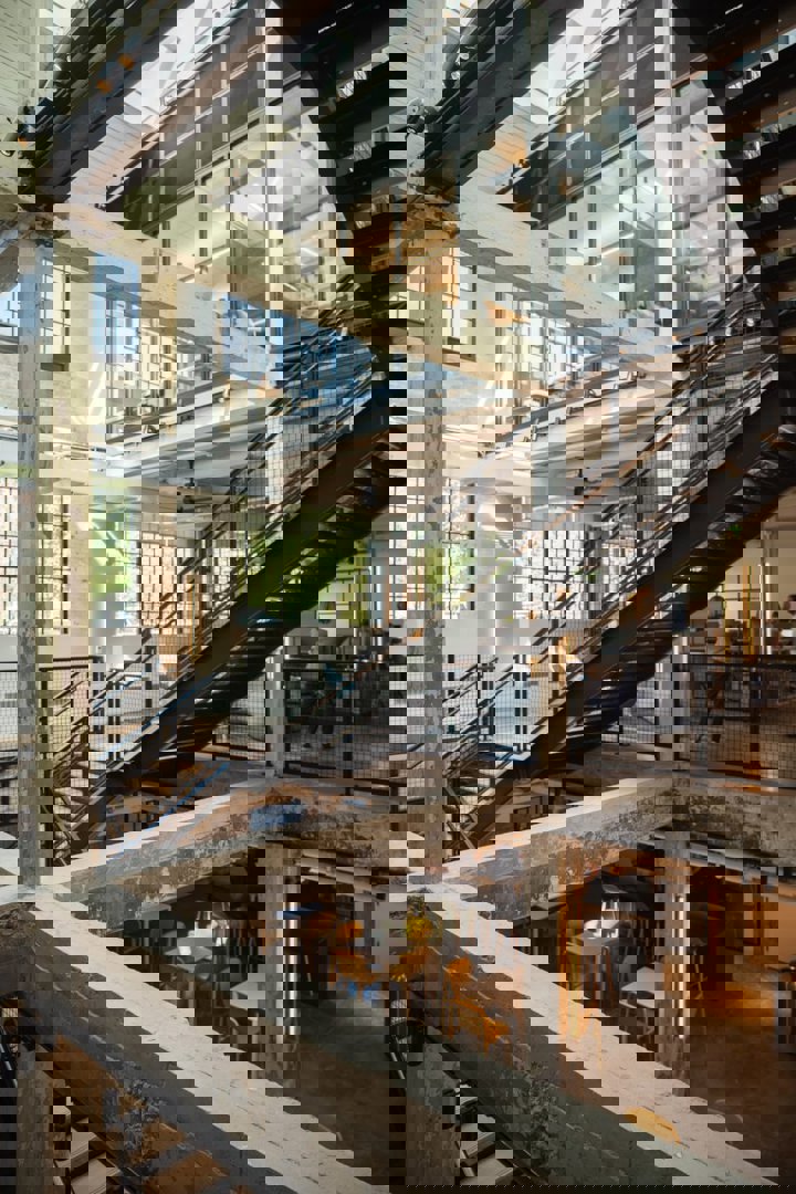 Le bâtiment B, le plus ancien du site, a été construit en bois massif et en briques en 1910. Il dispose désormais d'un auditorium à double hauteur et d'un espace de réception avec des sièges rétractables et des écrans de projection à la pointe de la technologie. L'équipe a renforcé la toiture afin de créer un toit végétalisé et une terrasse donnant sur un ruisseau voisin. Les bâtiments C et D, tous deux de deux étages, ont été rénovés en vue d'une utilisation future, par exemple pour accueillir un restaurant, un atelier, des bureaux ou des commerces.