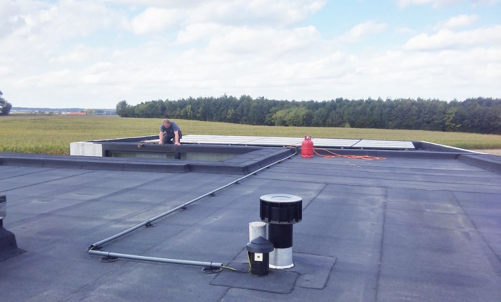 L’environnement vallonné rend la toiture visible de différents endroits, c’est pourquoi celle-ci a été conçue comme une cinquième façade. La toiture plate fait en sorte que la maison ne prenne pas de position dominante dans la rue et devienne même invisible quand les cultures sont à maturité. Les techniques modernes peuvent facilement être enlevées pour ne pas s’imposer à la simplicité de l’architecture. L’étanchéité bitumineuse a été expressément choisie pour permettre un niveau de détail minimal. Le bâtiment ne dispose pas de rives traditionnelles et les raccords avec le béton ont pu être réalisés plus durablement au moyen d’une étanchéité liquide.