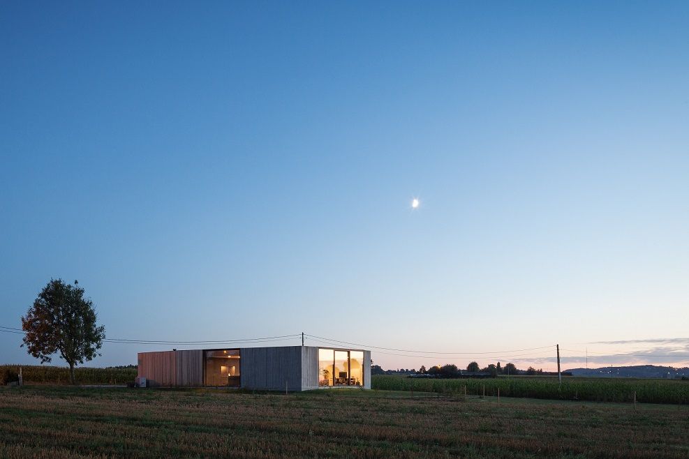 La palette de couleurs de l’environnement a inspiré le choix des matériaux. L’habitation est construite en bois grisé, béton avec motifs de planches et châssis sombres anodisés. Le béton apparent gris fait référence à la mémoire historique de l’endroit et accentue le caractère massif de la maison. A l’intérieur, une ambiance chaleureuse est créée entre autres par le béton coulé sur place et le parquet en chêne. Implantée au centre, la cuisine en chêne décapé noir donne une impression tranquille et sobre grâce à laquelle l’attention reste portée sur le paysage environnant.