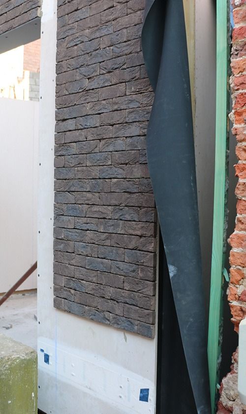 Etex Building Performance et Machiels Building Solutions ont uni leurs efforts pour voir comment relever ce défi. « D'un point de vue technique, il est impossible de coller des plaquettes de brique directement sur ces panneaux en bois aggloméré liés au ciment », explique Bart Goossens. « Nous avons alors décidé d’équiper le Siniat Duripanel de lattes de support verticales. Les lattes étant suffisamment épaisses, elles pouvaient même être vissées directement dans les plaques agglomérées. Une plaque d’appui en fibres-ciment, Eternit Eter-Backer HD, a été fixée sur ces lattes de façade. Les plaquettes ont ensuite été collées dessus. Le processus s’est terminé par l'installation des fenêtres et portes, ainsi que le parachèvement. »