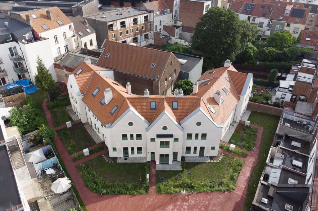 « Le parti pris a été de diviser le bâtiment en une série de maisons unifamiliales mitoyennes traversantes, permettant d'accueillir des familles nombreuses tout en augmentant la densité de l'îlot », expliquent les architectes de Karbon' Architecture et Urbanisme. « Cette approche rationnelle va permettre par la suite une économie d'entretien, de travaux et faciliter la gestion. » Si chaque maison possède une cour et un jardin privatifs, la position centrale de l'espace extérieur de la Cité et son rapport avec le voisinage de l'îlot en font un véritable enjeu du projet. « C'est au travers de points d'activation tels que les potagers, les composts, les pompes à eau manuelles ..., que l'intérieur du site se veut être un lieu fédérateur pour l'îlot, un lieu de vie de qualité, fait d'échanges et de rencontres positives. »