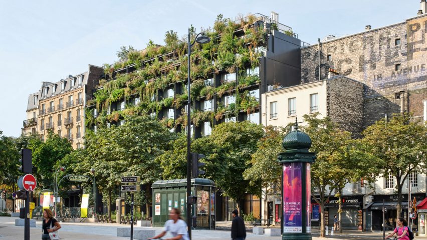 Un exosquelette en acier soutient le jardin vertical servant de façade à l'hôtel parisien Villa M, conçu par le bureau d’architecture franco-brésilien Triptyque en collaboration avec le designer Philippe Starck et le bureau paysagiste Coloco. Situé à Montparnasse, l'hôtel de 8 000 mètres carrés comprend également un restaurant, un espace de travail, une salle de sport et un rooftop bar, qui, selon l'équipe, sont tous axés sur un mode de vie sain et sur le désir de "ramener la nature dans la ville".