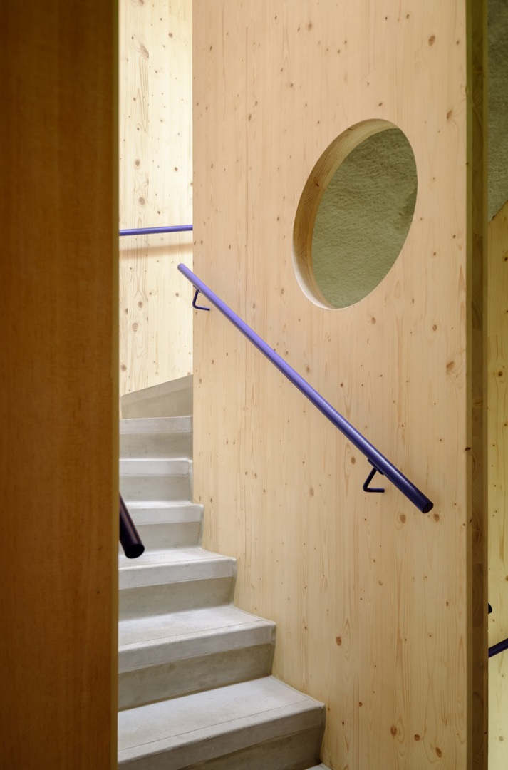 Plusieurs de ces principes circulaires sont liés à la structure CLT du bâtiment. Premièrement, le bâtiment a été assemblé à sec, ce qui permet de le démonter à un moment ou à un autre.