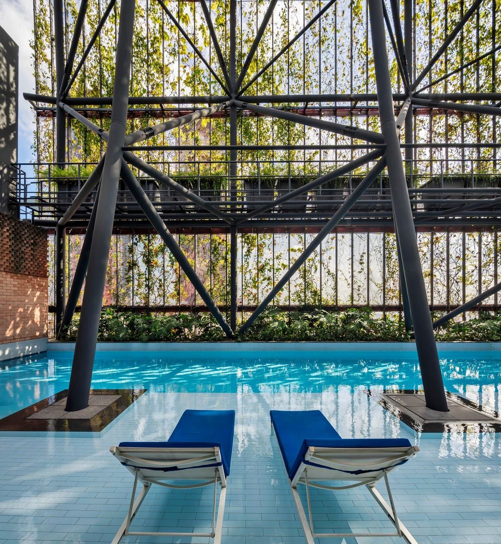 La piscine du toit-terrasse est divisée en deux, de part et d'autre du restaurant. À la différence de la plupart des toits-terrasses d'hôtel, entièrement dédiés à la vue sur la skyline, l'ensemble ou presque de l'espace est ici entouré d'un écran végétal. Une preuve de plus de la vision non conventionnelle qu'a WOHA de l'architecture. Plutôt qu'une vue, ce toit-terrasse est une réelle oasis dédiée à l'intimité et à la tranquillité, une surprenante escapade tropicale en plein cœur de la ville.